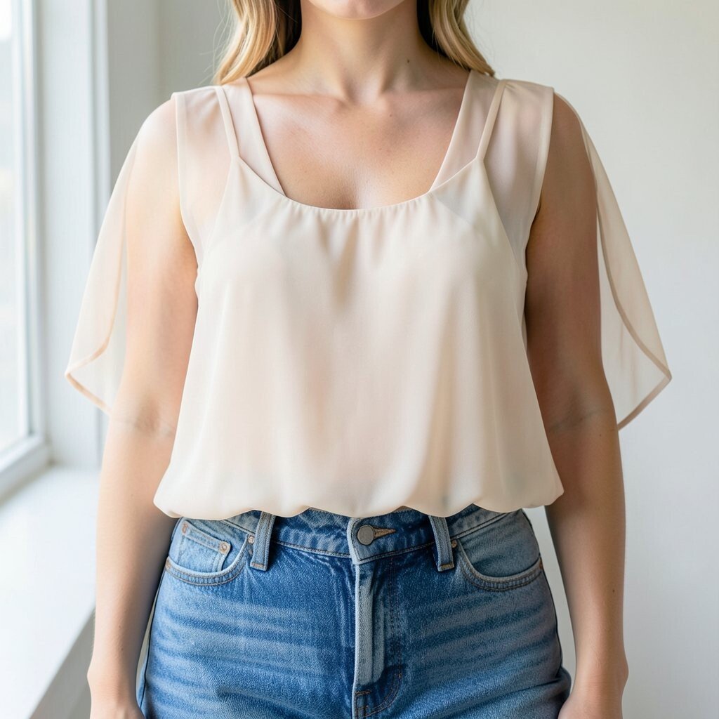 A chiffon overlay top with jeans creates a pretty mix of dressy and casual. The soft top layer adds elegance, while denim keeps the look relaxed.