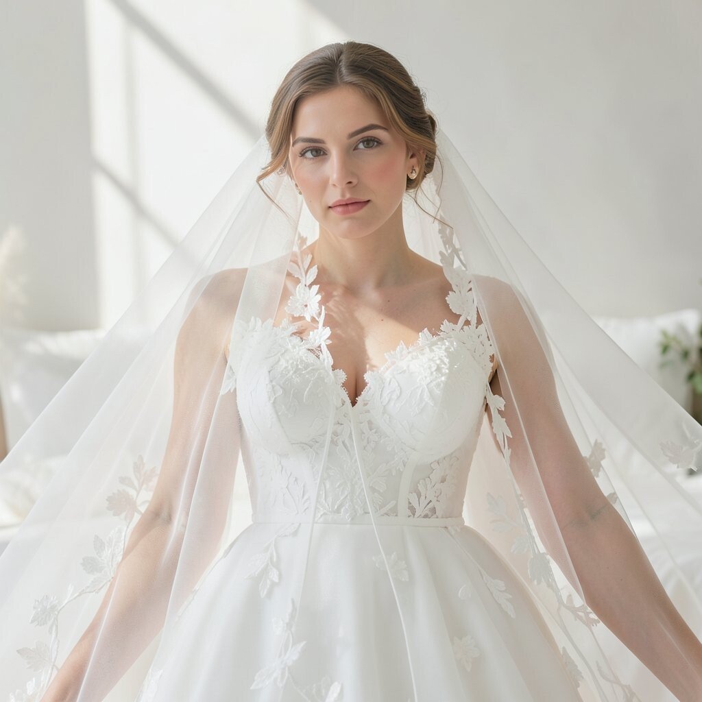 A chiffon overlay bridal look feels soft, dreamy, and romantic. The layer can appear on the gown, veil, sleeves, or train and adds a gentle glow.