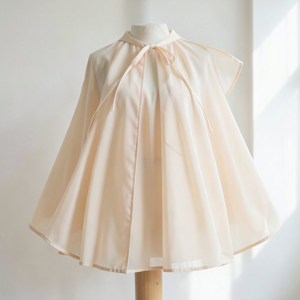 A chiffon overlay cape adds instant grace. It drapes from the shoulders and moves like a soft cloud.