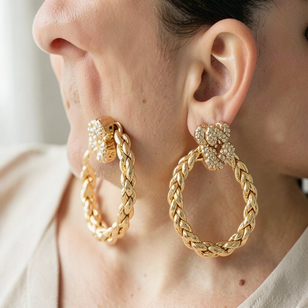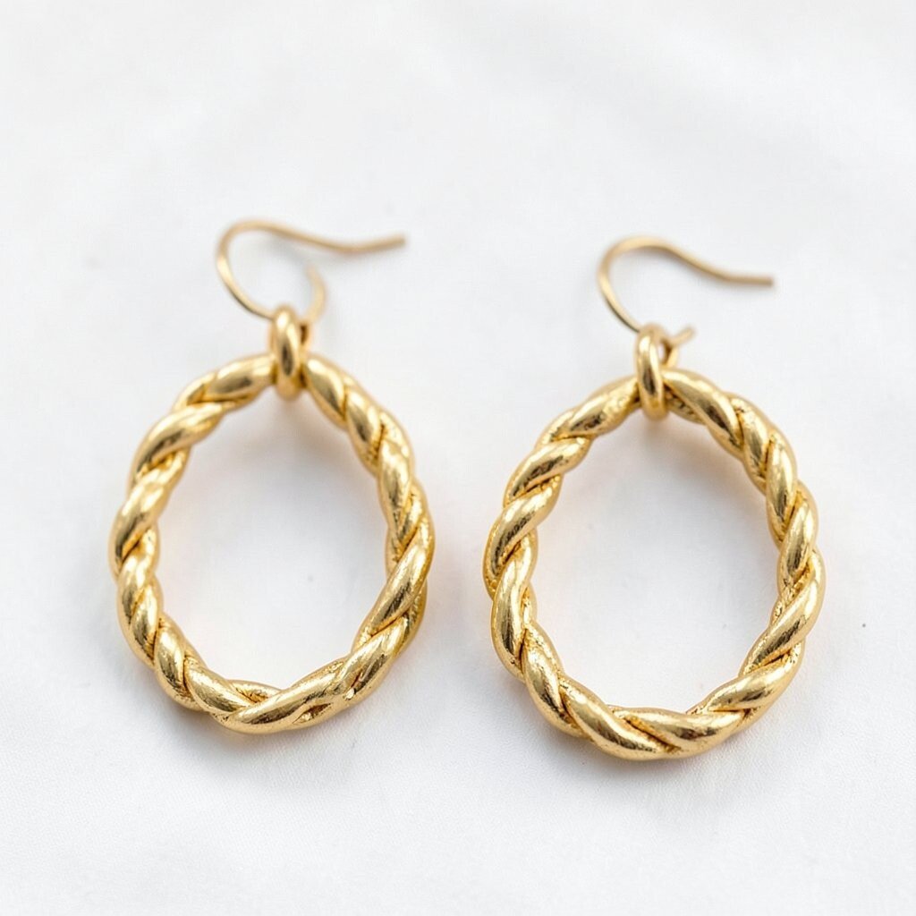 Braided gold earrings offer an intricate and detailed design. The braiding creates a textured look that is both elegant and eye-catching. These earrings are perfect for those who appreciate craftsmanship and detail.