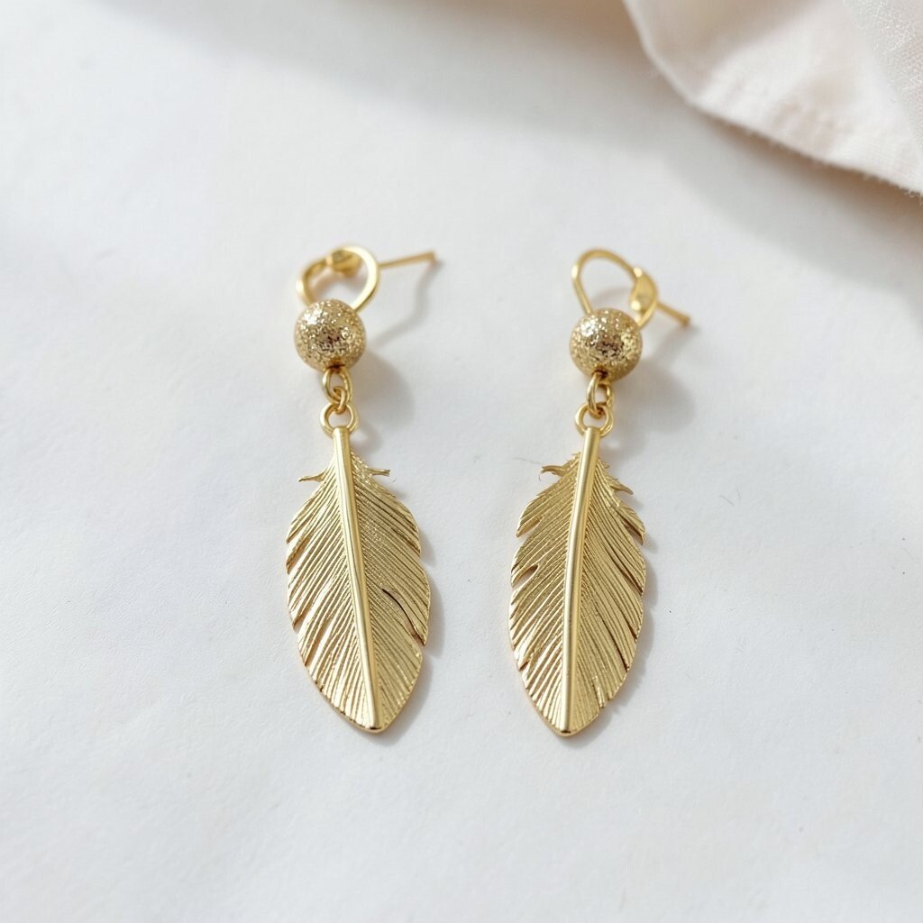 Gold feather earrings have a delicate and airy design. The feather motif adds a bohemian and whimsical touch to your look. These earrings are perfect for those who love nature-inspired jewelry.
