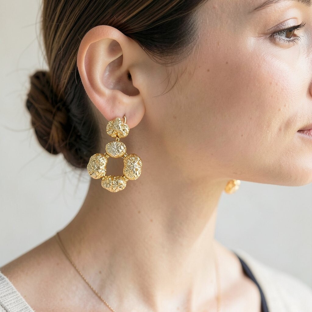 Chunky square earrings offer a bold and modern look. Their geometric shape makes them stand out, adding interest to your ensemble. These earrings are ideal for those who like to make a statement with their accessories.
