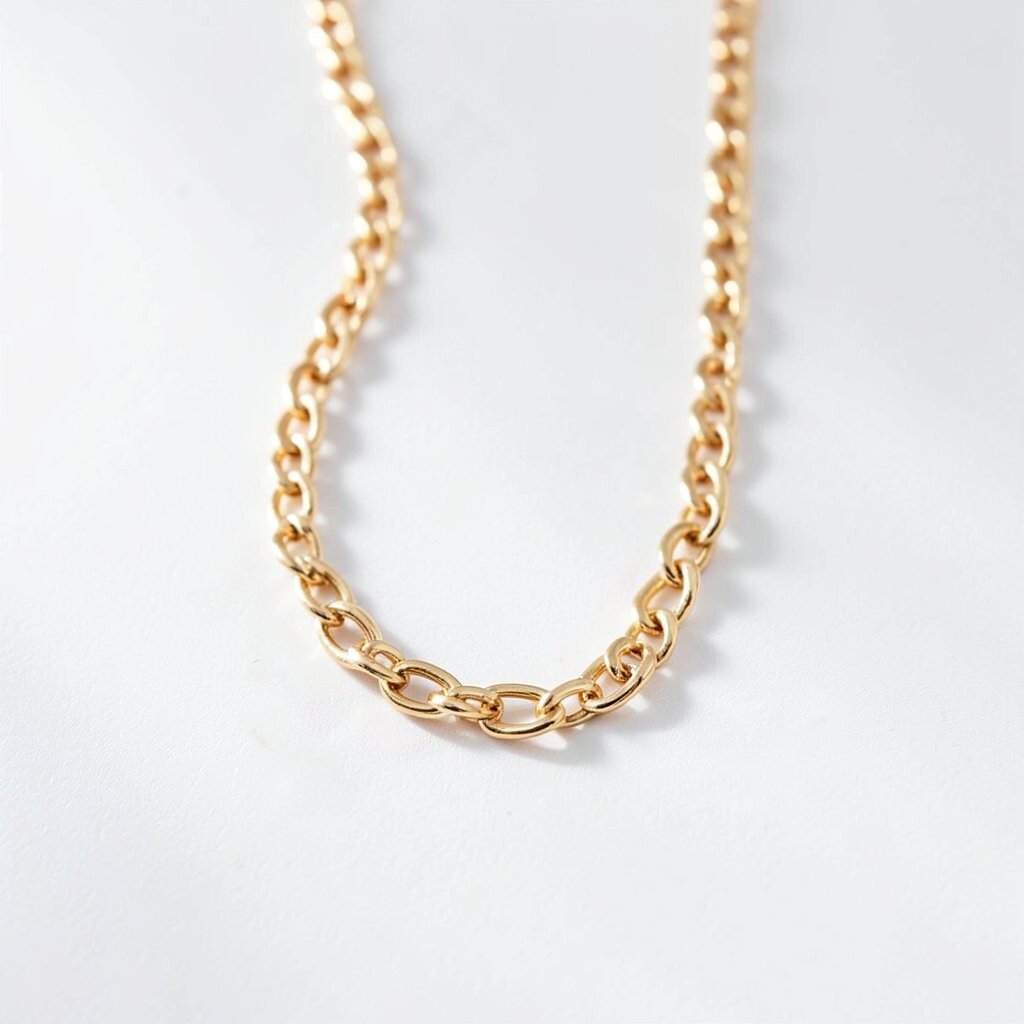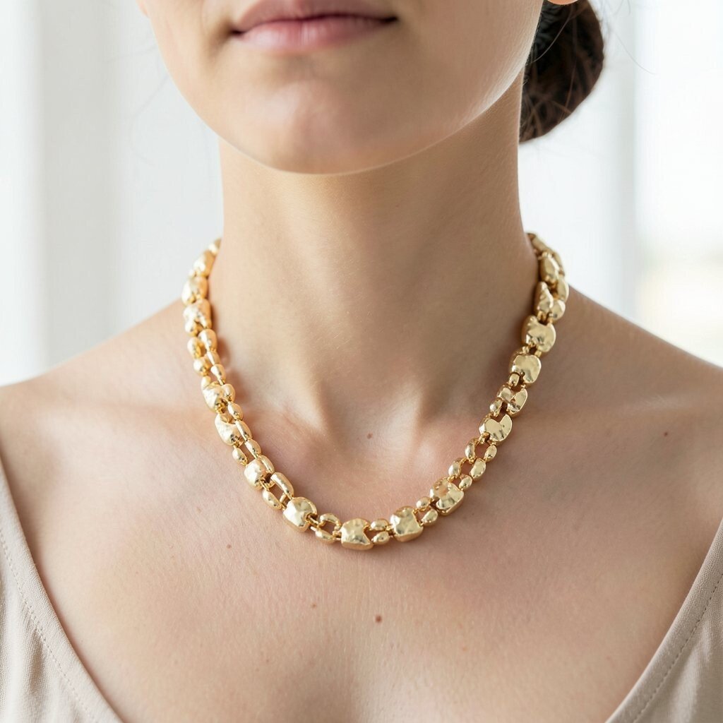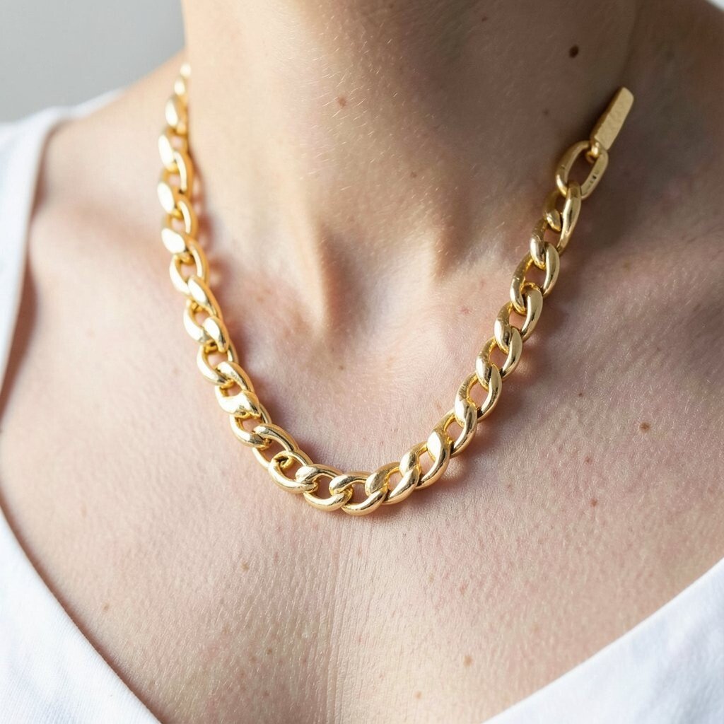 The chain link necklace is a bold, industrial-inspired piece. Its chunky links make a striking impact.