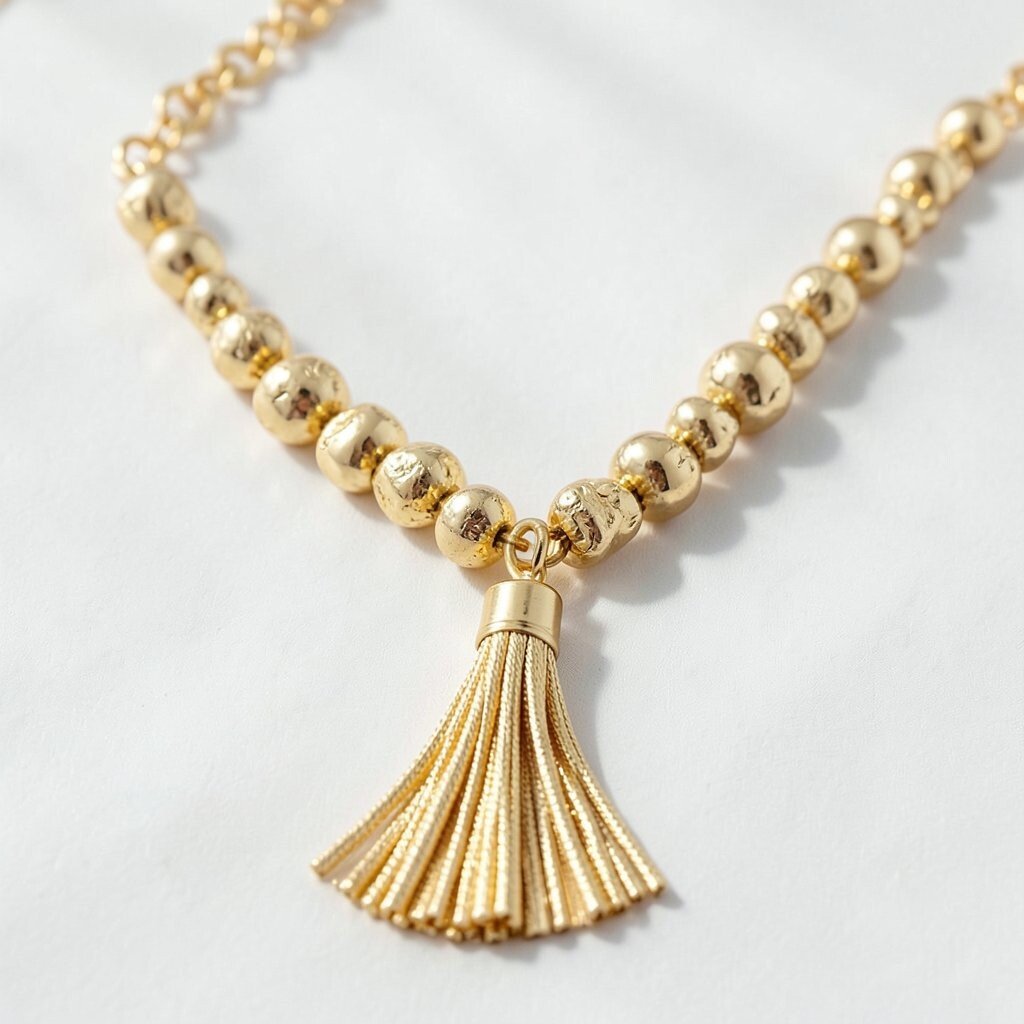The gold tassel necklace adds a playful touch to your collection. The tassels sway with your movements.