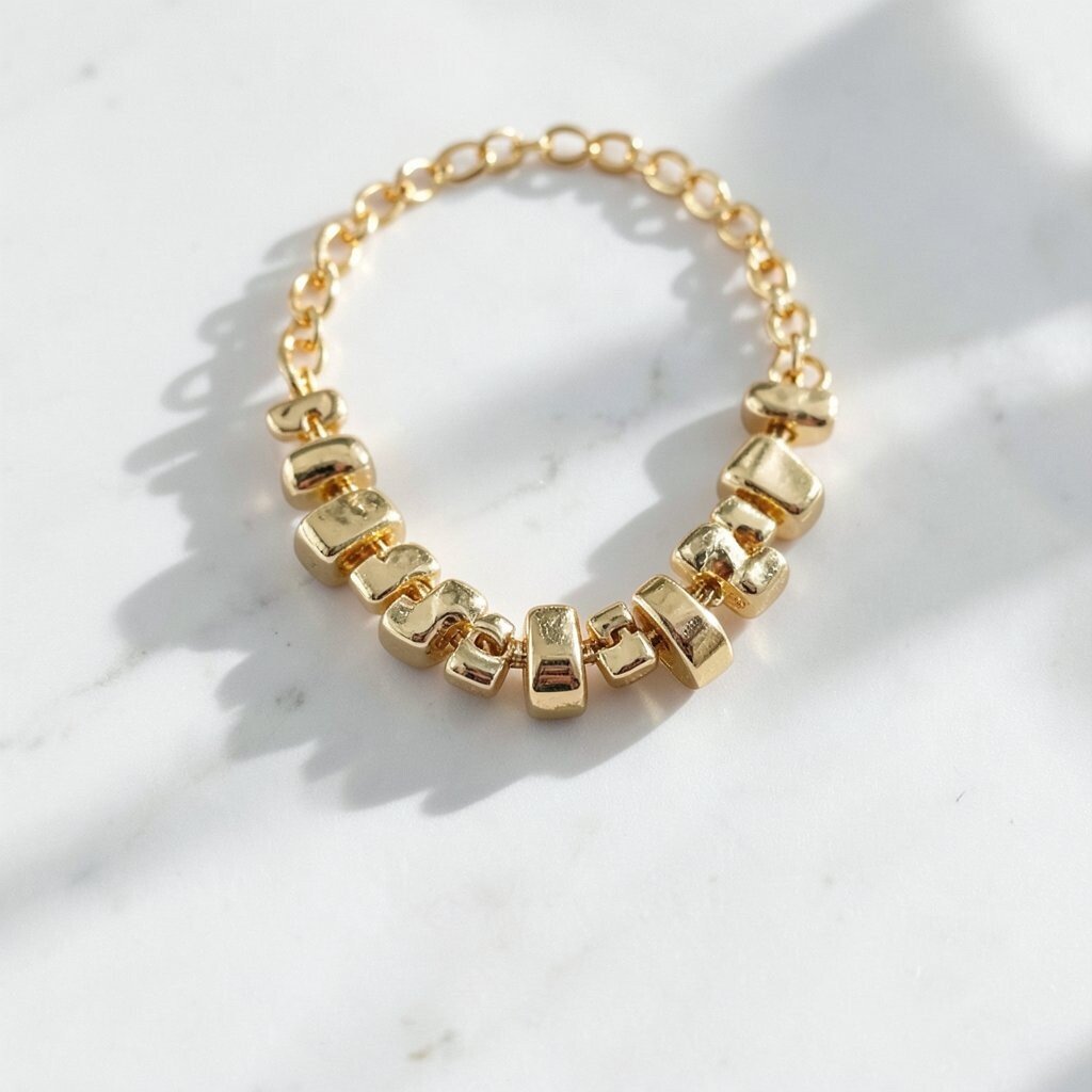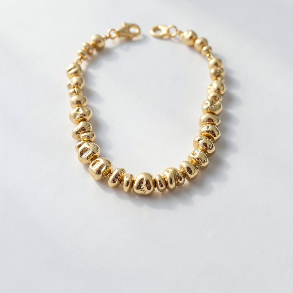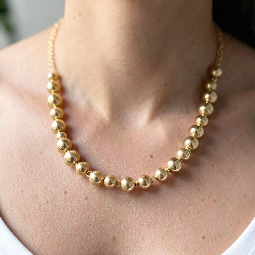 The beaded gold necklace offers a textured appeal with its array of beads. The beads add dimension and interest.