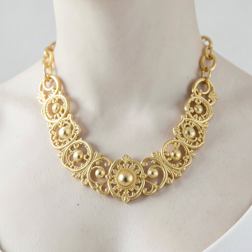 The gold filigree necklace showcases intricate patterns and designs. The detailed work is mesmerizing.