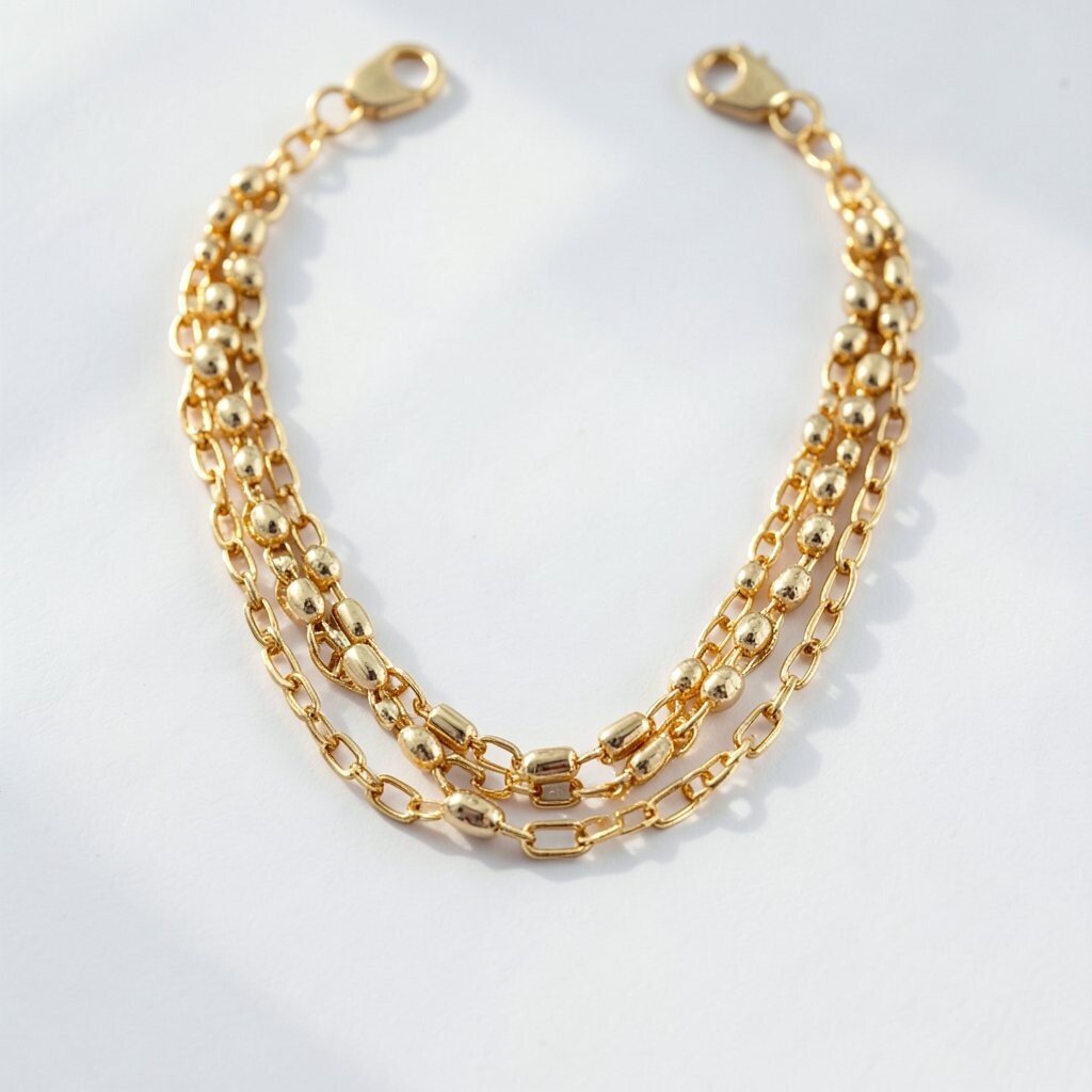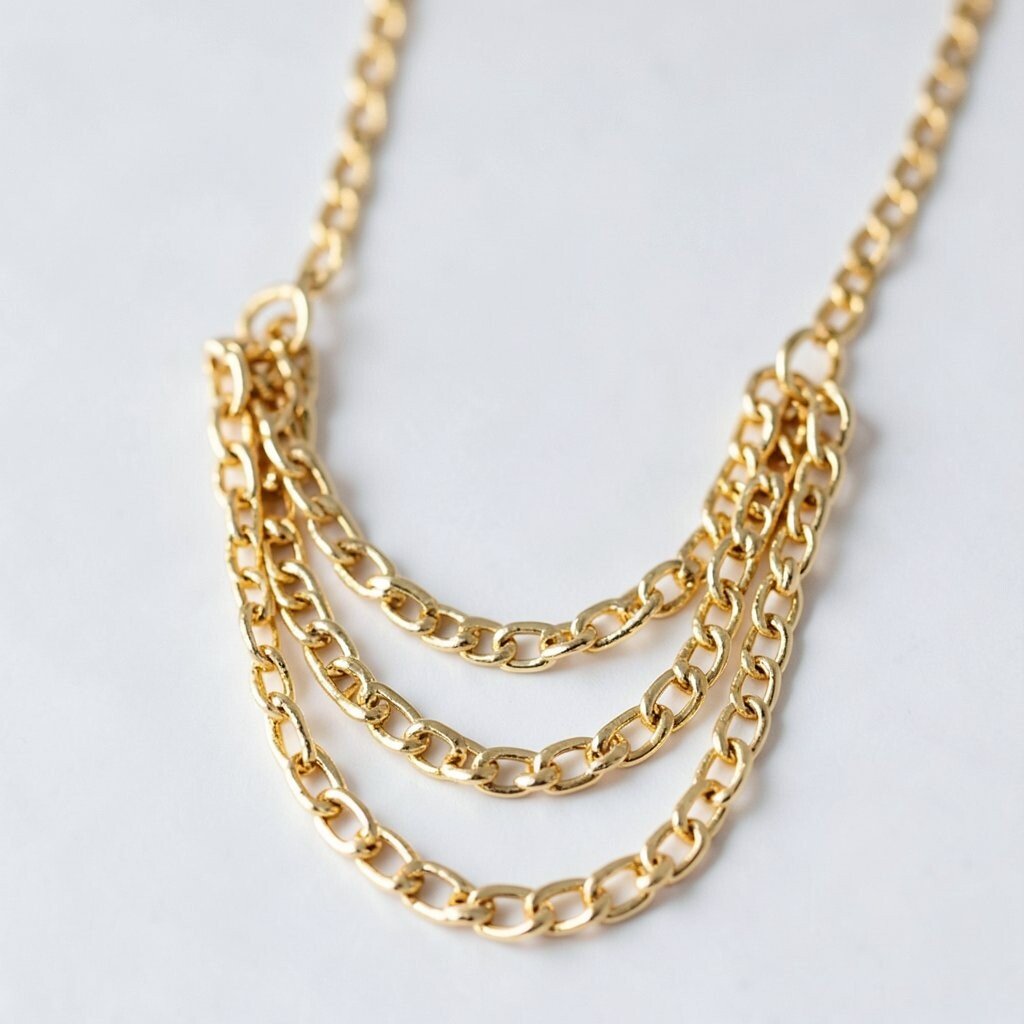 The layered gold chain necklace offers a dynamic style. Each chain is of varying lengths, creating a cascading effect.
