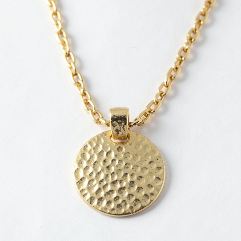 The hammered disc necklace brings a unique flair to your style. Its uneven texture catches the light beautifully.
