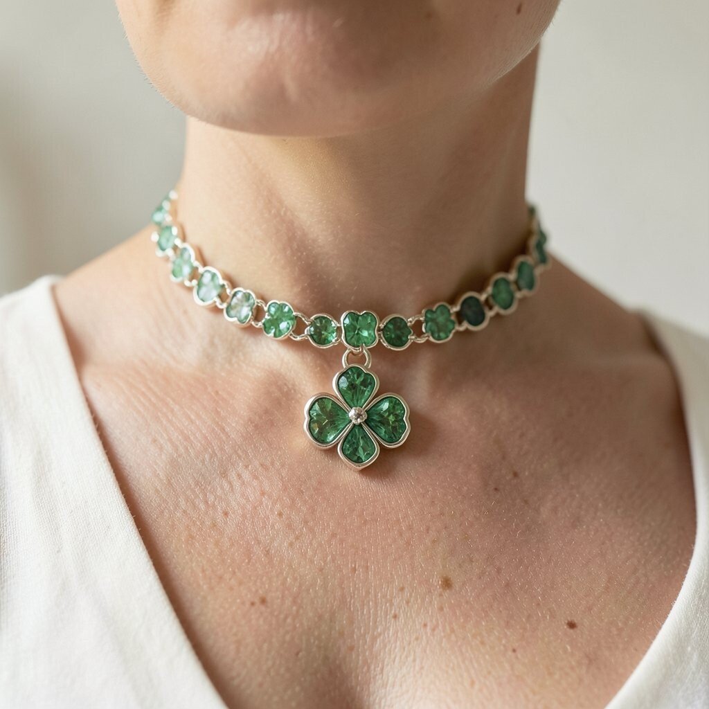 These chokers can be made from velvet, leather, or metal chains. The clover charm often dangles delicately from the center.