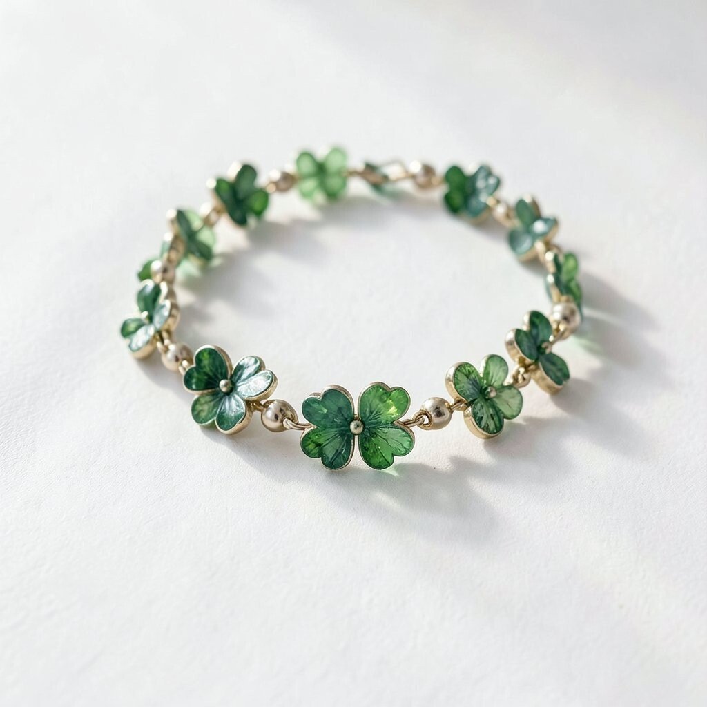 A clover charm bracelet jingles with every movement. It serves as a constant reminder of positivity.