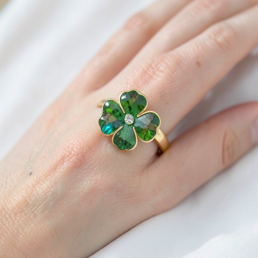 These rings are available in various metals, including gold and silver. The clover design can be embossed or inlaid with colored stones.