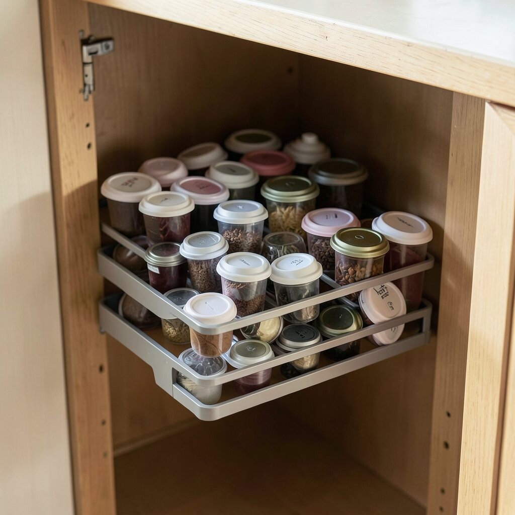 Consider adding labels to the trays for easy identification. Pull-out trays are perfect for those who prefer a clean, uncluttered countertop. They offer a sleek and modern storage solution for any kitchen.