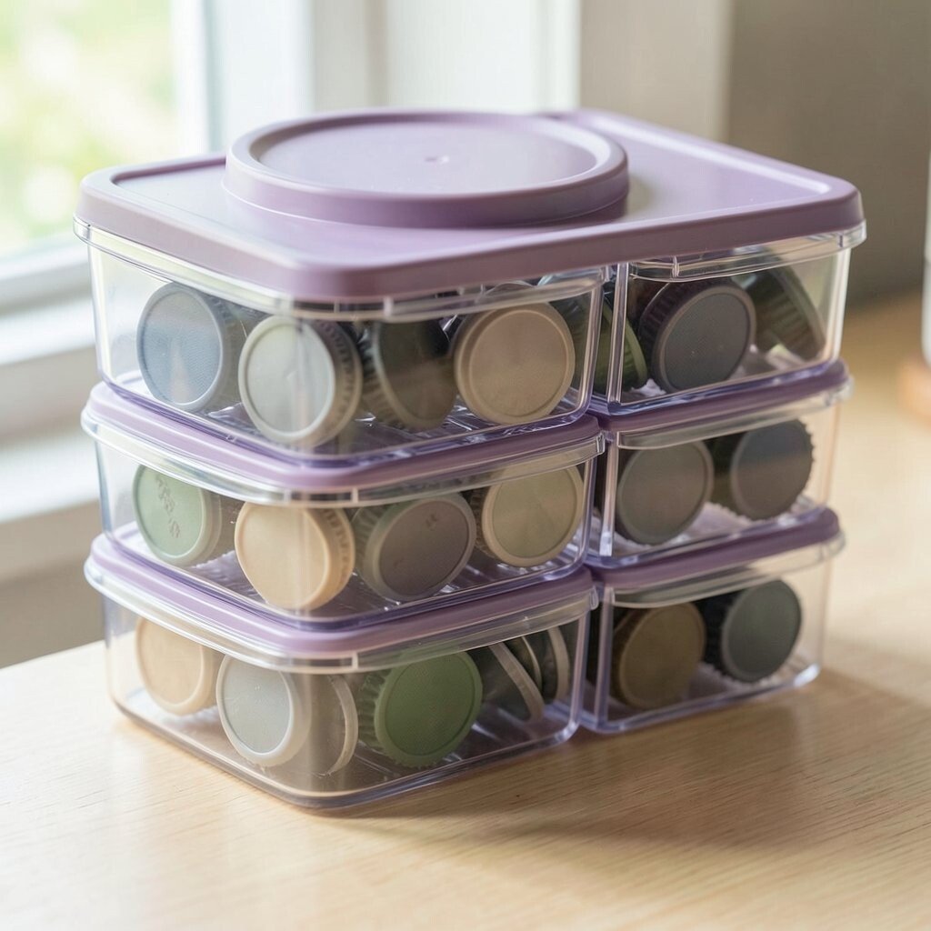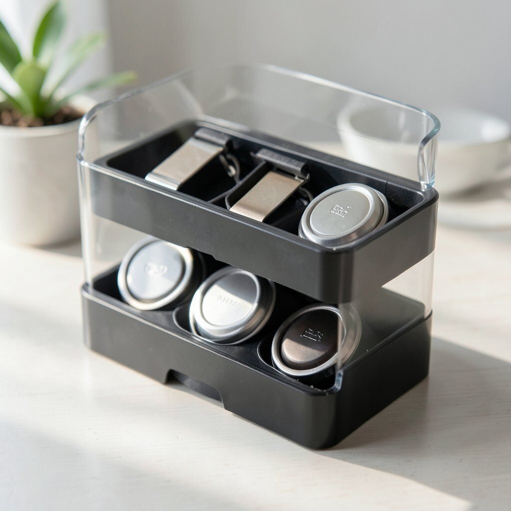 Stackable clear bins offer a simple yet effective way to organize coffee pods. Their transparency allows you to see the contents at a glance.