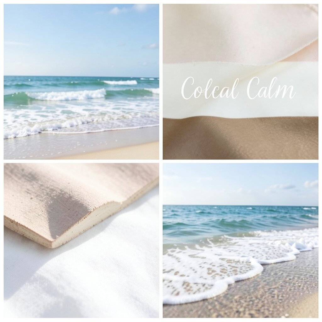 Cool blues, soft greys, and sandy beiges make up this tranquil palette. It’s soothing and peaceful, perfect for beachside themes.