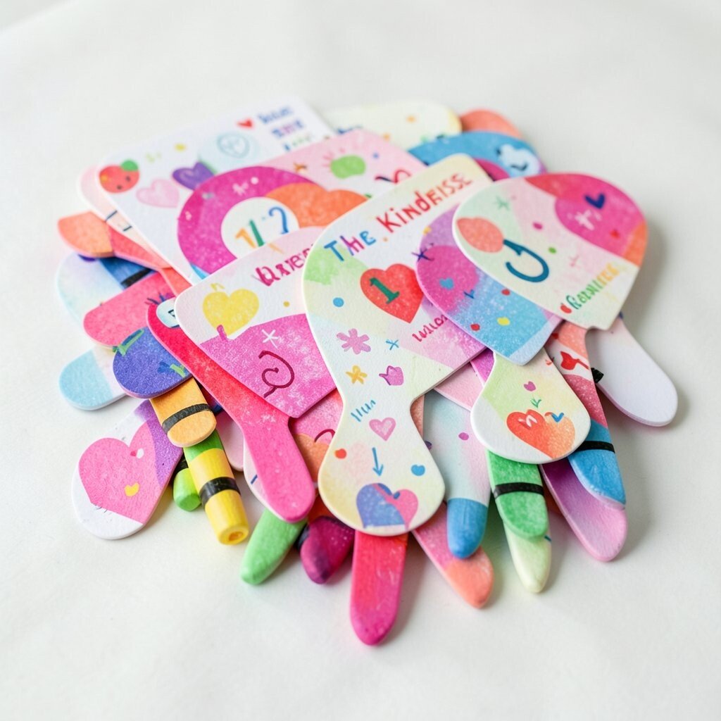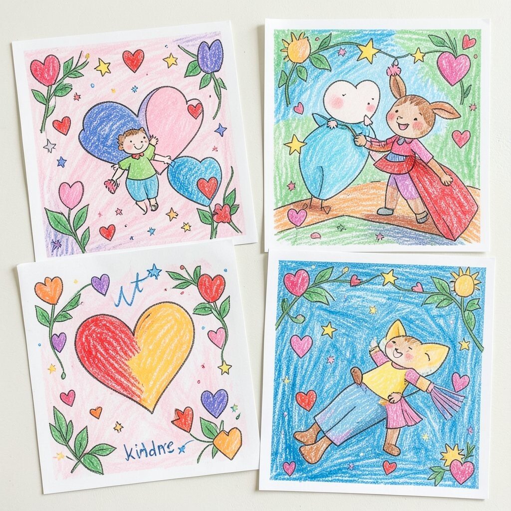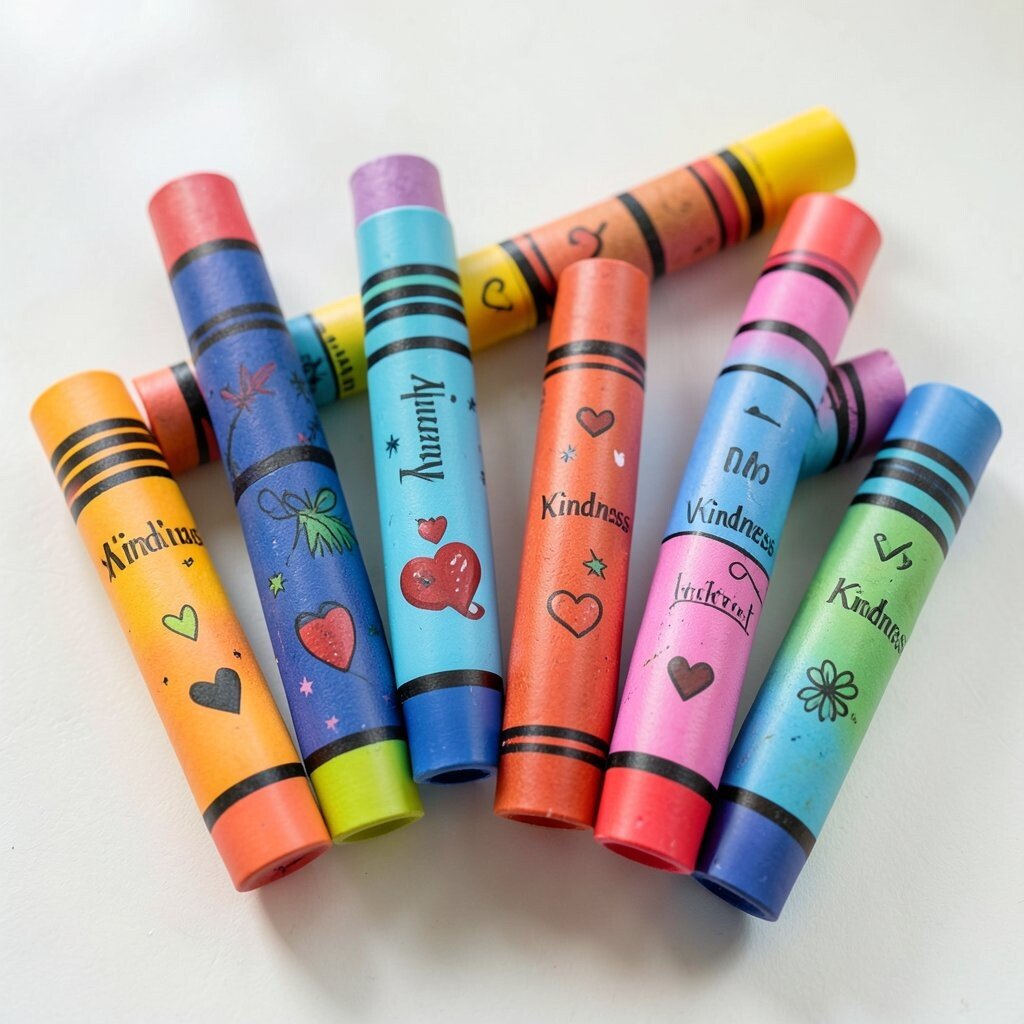 Children can draw small hearts on sticker paper or use printed crayon designs. Add a kind word like “share” or “smile” to tie the theme to kindness.