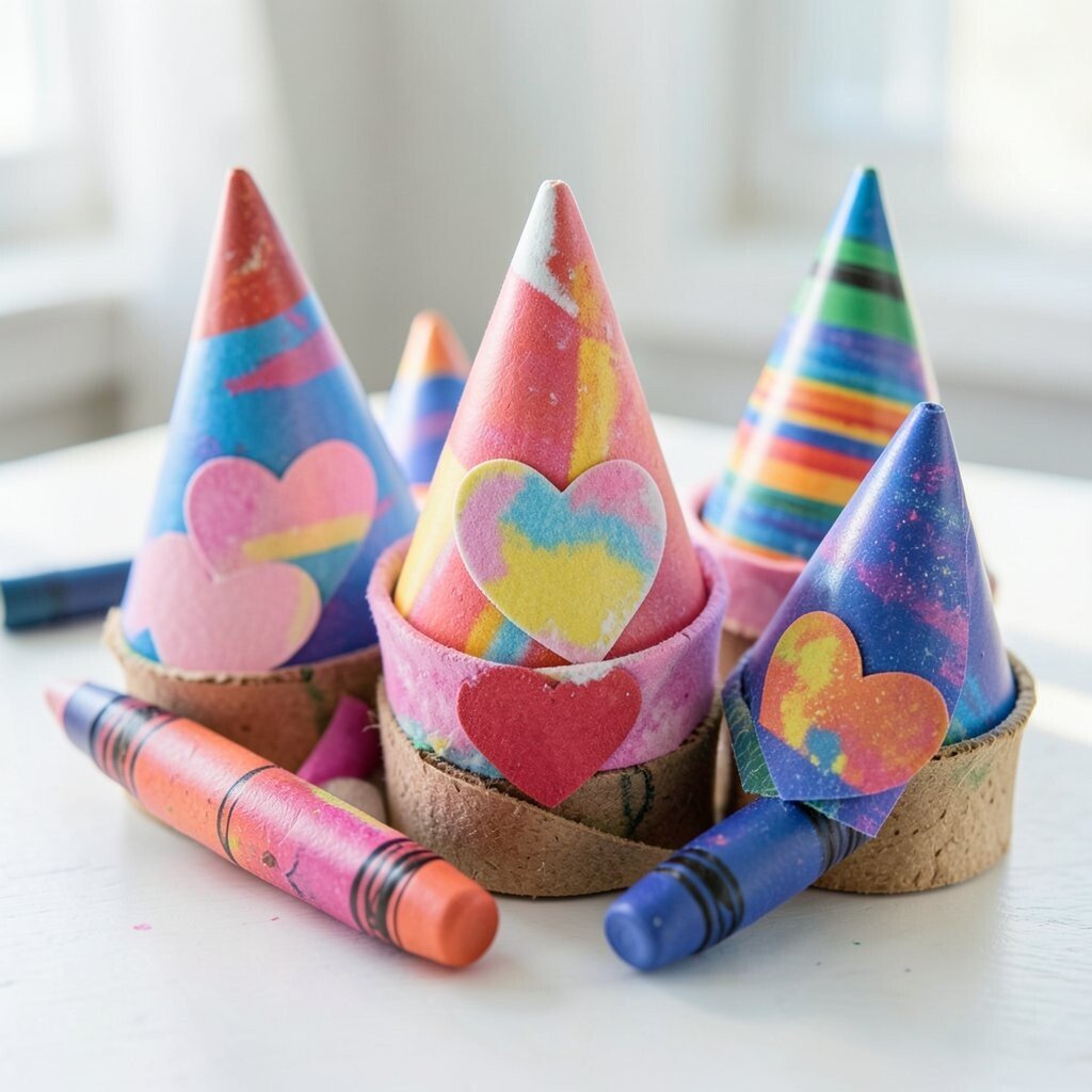 Party hats with crayon hearts make Valentine celebrations feel extra fun. The colorful shapes add a playful touch that children enjoy right away.