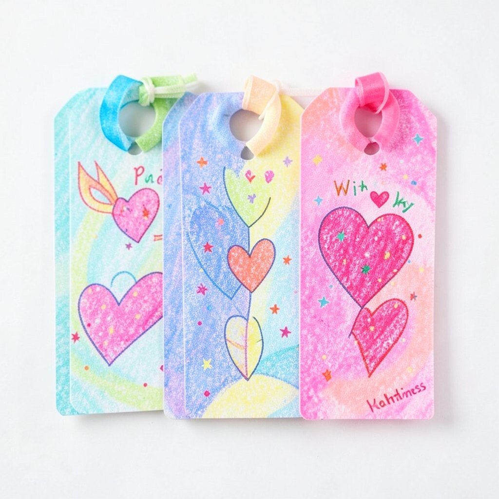 Use thick paper, bold markers, and a small crayon cutout to make each tag feel special. Kids can write a kind note on the back, which makes the gift more personal and warm.