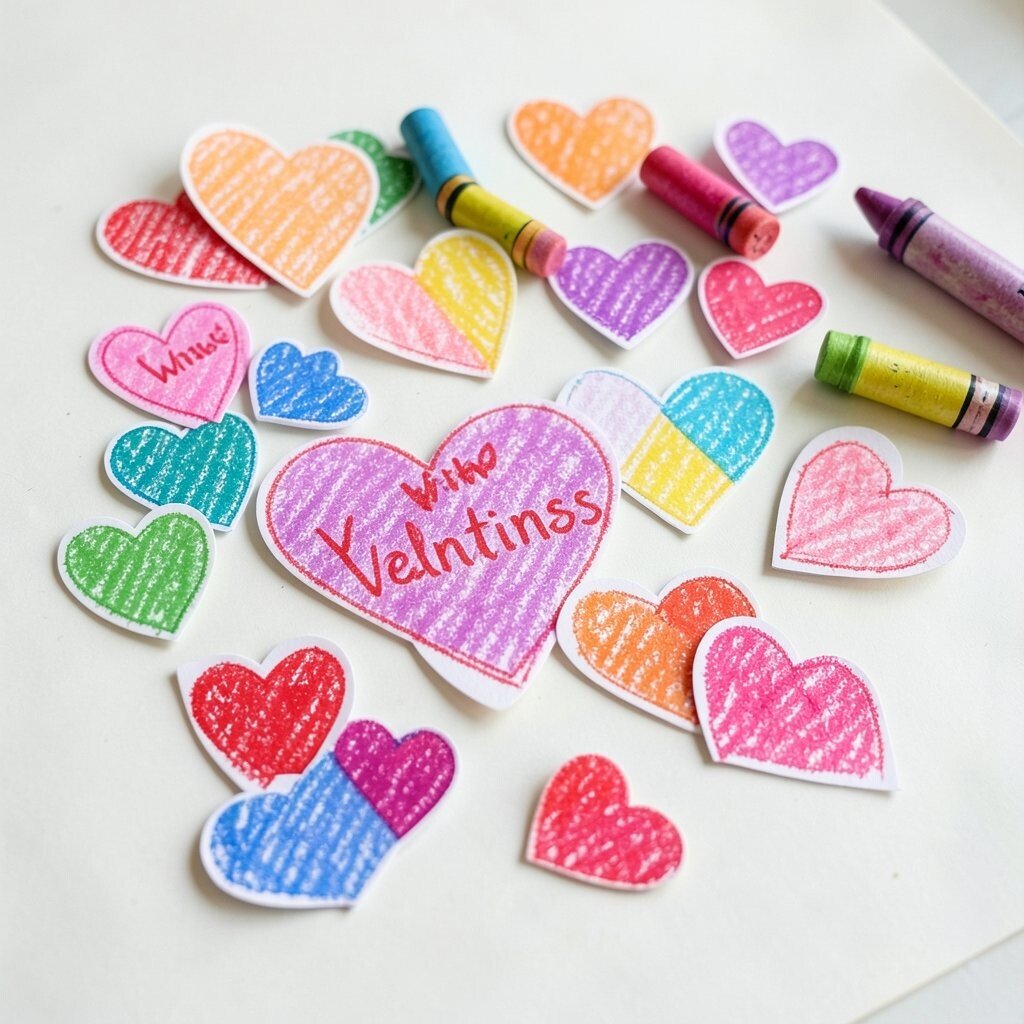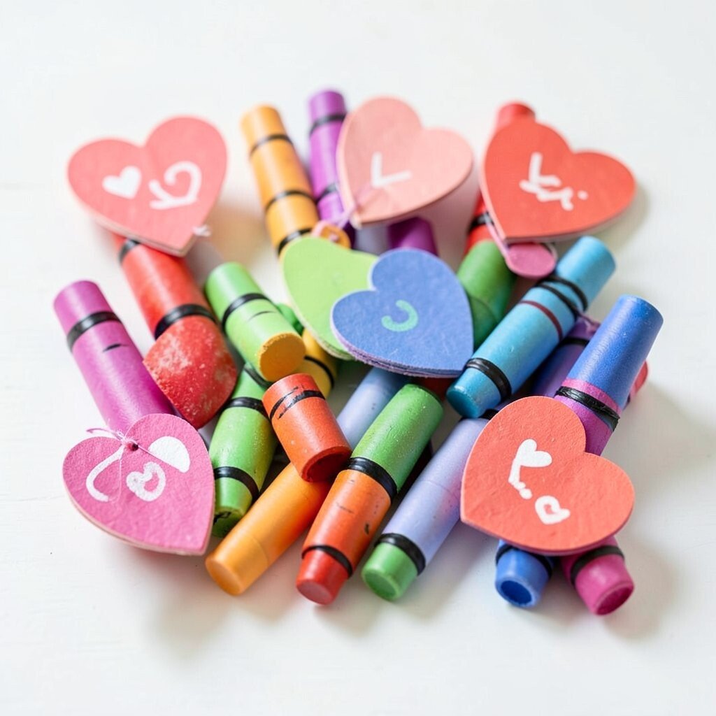 Heart-shaped crayon tags add a cheerful touch to any Valentine gift bag. They look bright, neat, and full of happy color.