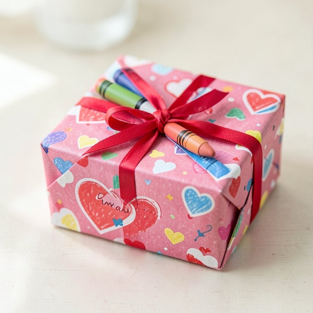 Use plain paper and draw hearts, swirls, or dots with crayons in Valentine shades. Kids can add their own name or a short message to make the wrap feel personal.