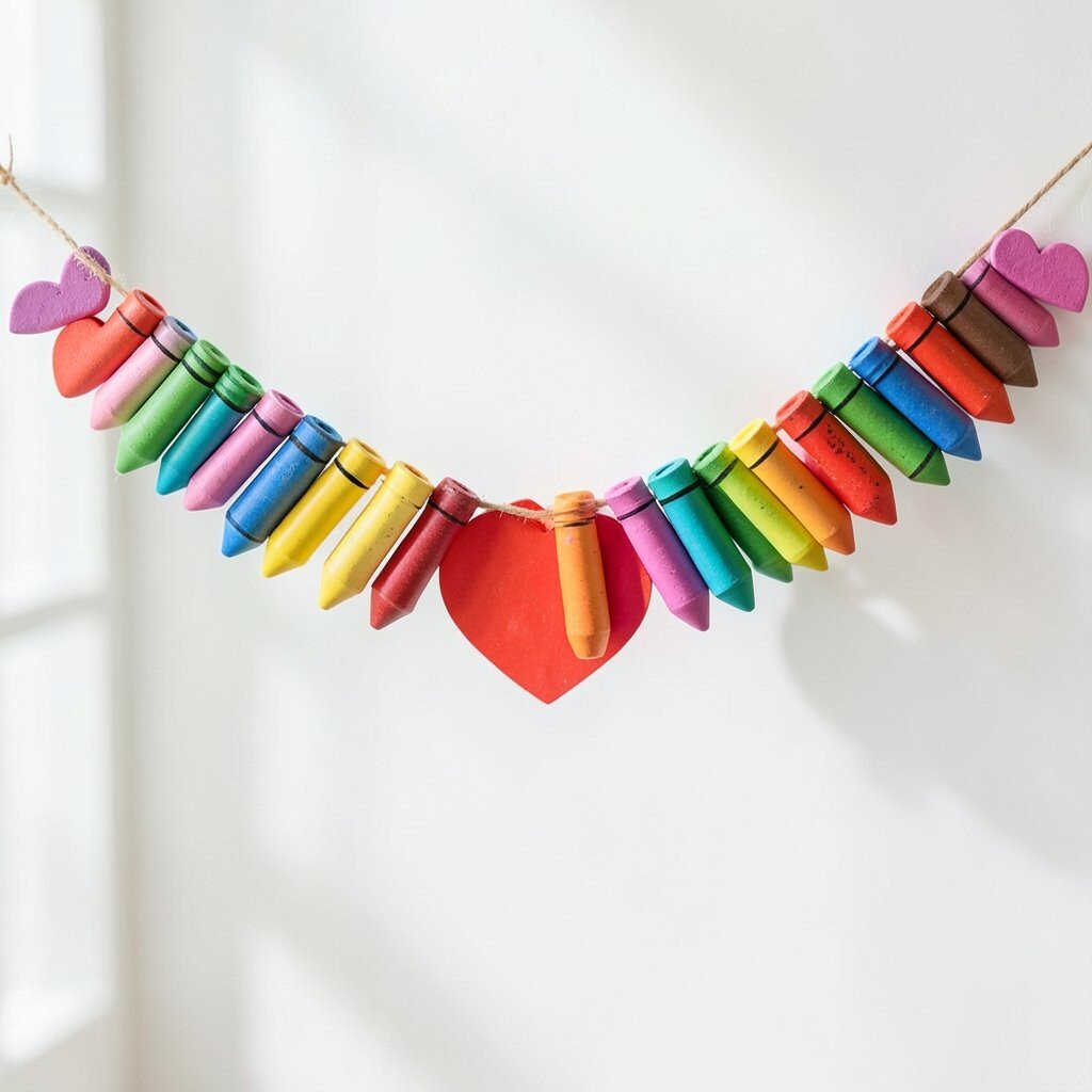 Cut hearts from colored paper or use real crayon shavings sealed in clear shapes. Kids can help string them together, which makes the craft feel like a team project.