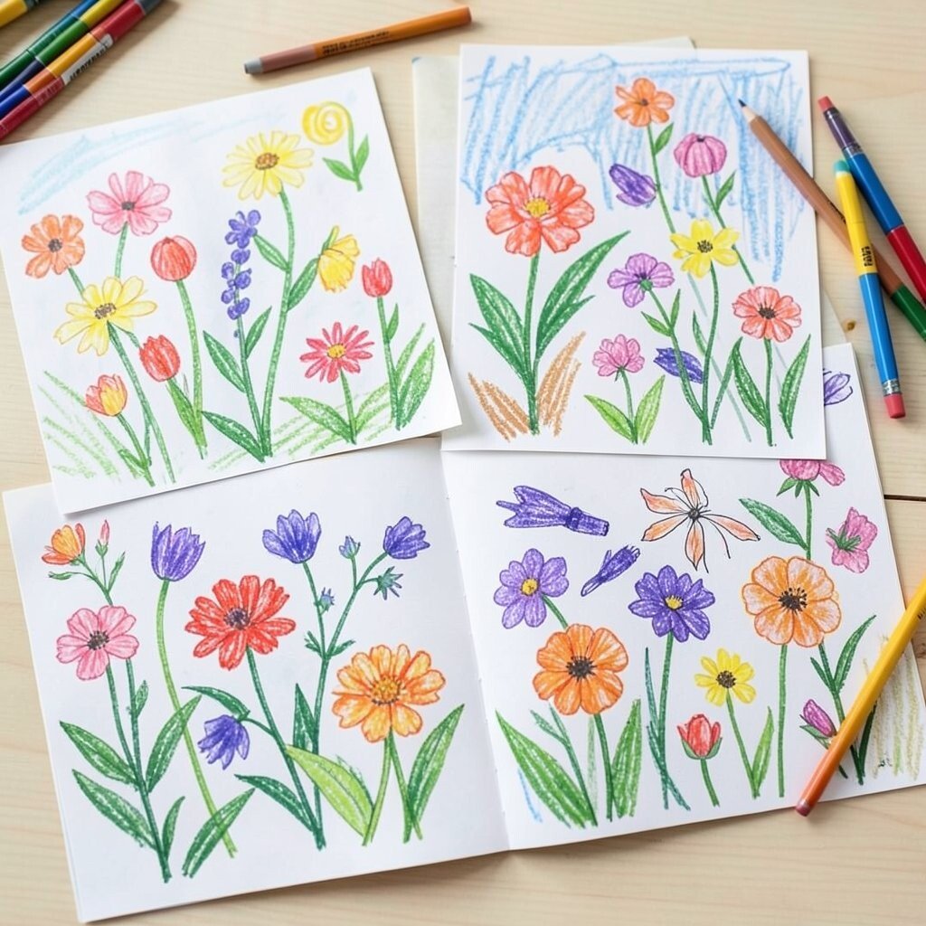 Draw a garden full of flowers with thick crayon stems, petals, and leaves. The page becomes bright and happy, almost like a spring field.