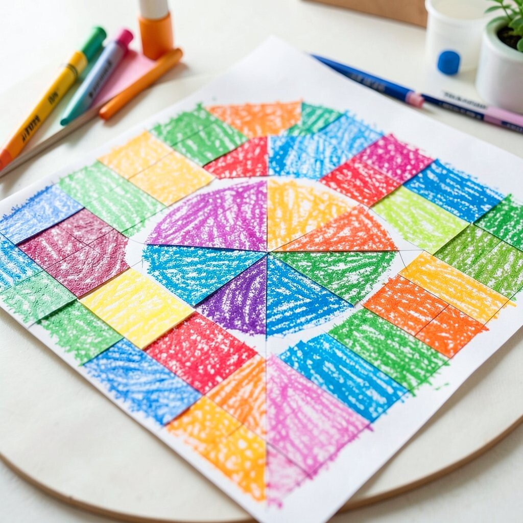 This project is wonderful for kids who enjoy order, design, and color mixing. It gives a sense of calm because each square can be different but still fit together. Use scrap paper or one large sheet to keep costs low, and choose a color family for a more polished result.