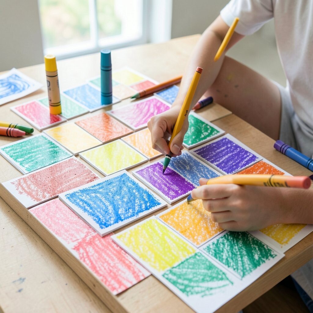 Divide paper into small squares and fill each one with a different crayon pattern. The page becomes a neat patchwork of stripes, dots, zigzags, and swirls.