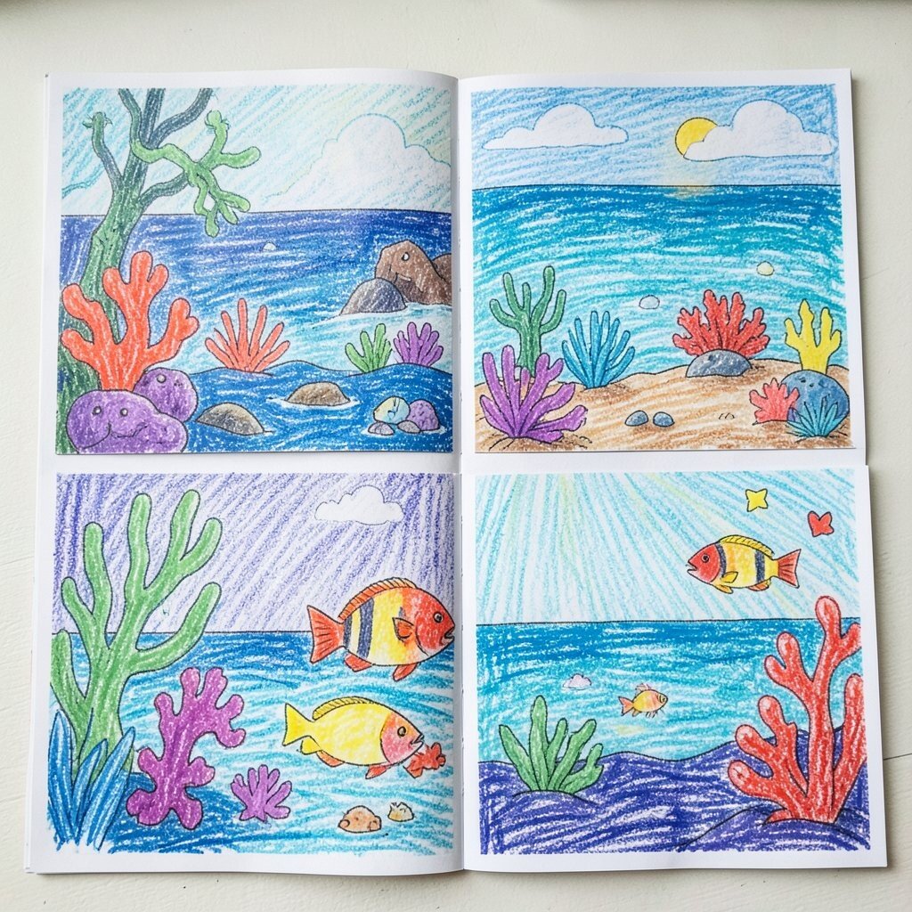 Blue, teal, and green crayons can build a calm sea with waves, fish, and shells. The finished scene feels cool and lively, like a beach day on paper.