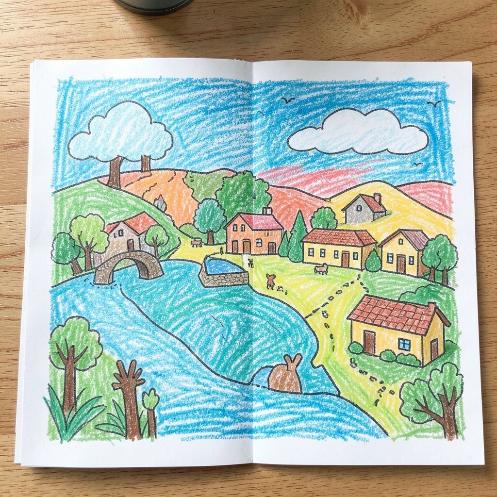 Draw a simple map of a room, yard, park, or dream land using crayons and clear paths. The page looks like a little world made by hand.
