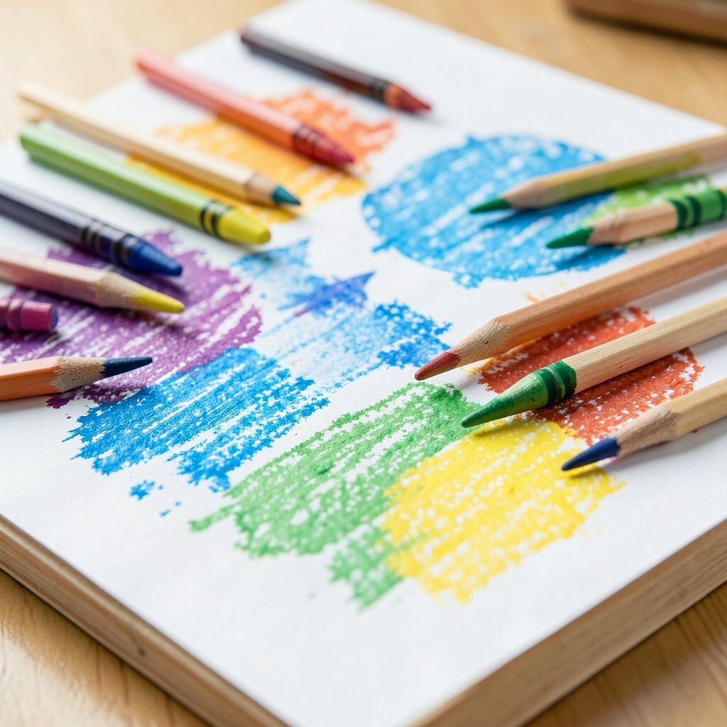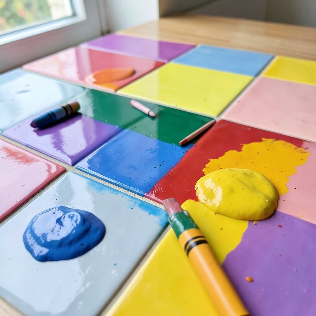 Plain ceramic tiles can become bright little art squares with crayons. The smooth surface lets colors sit on top in a way that feels crisp and clean.