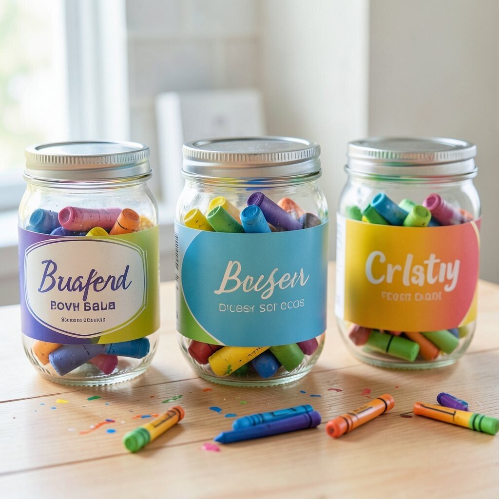 Mason jar labels can be turned into tiny art pieces before they go on the jar. Crayons make the labels feel cheerful and useful at the same time.