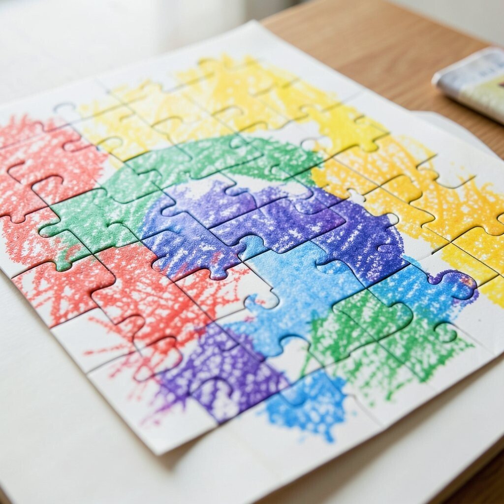 Loose puzzle pieces make a fun, unusual surface for crayons. Their shape gives each piece a built-in frame, which makes the art feel neat and playful.
