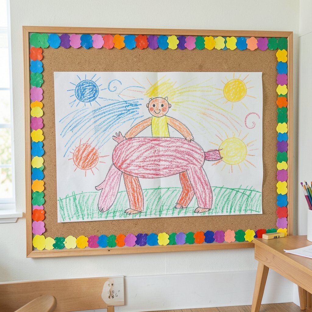 Bulletin board borders can be colored before they are pinned up, giving the whole room a handmade touch. Crayons make the edges feel cheerful, soft, and full of personality.