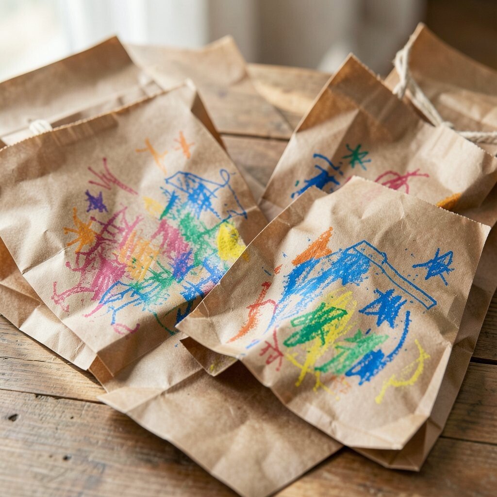 Brown paper bags are simple, but crayons give them a warm and lively feel. The paper has a rough texture that can make the colors look soft and earthy.