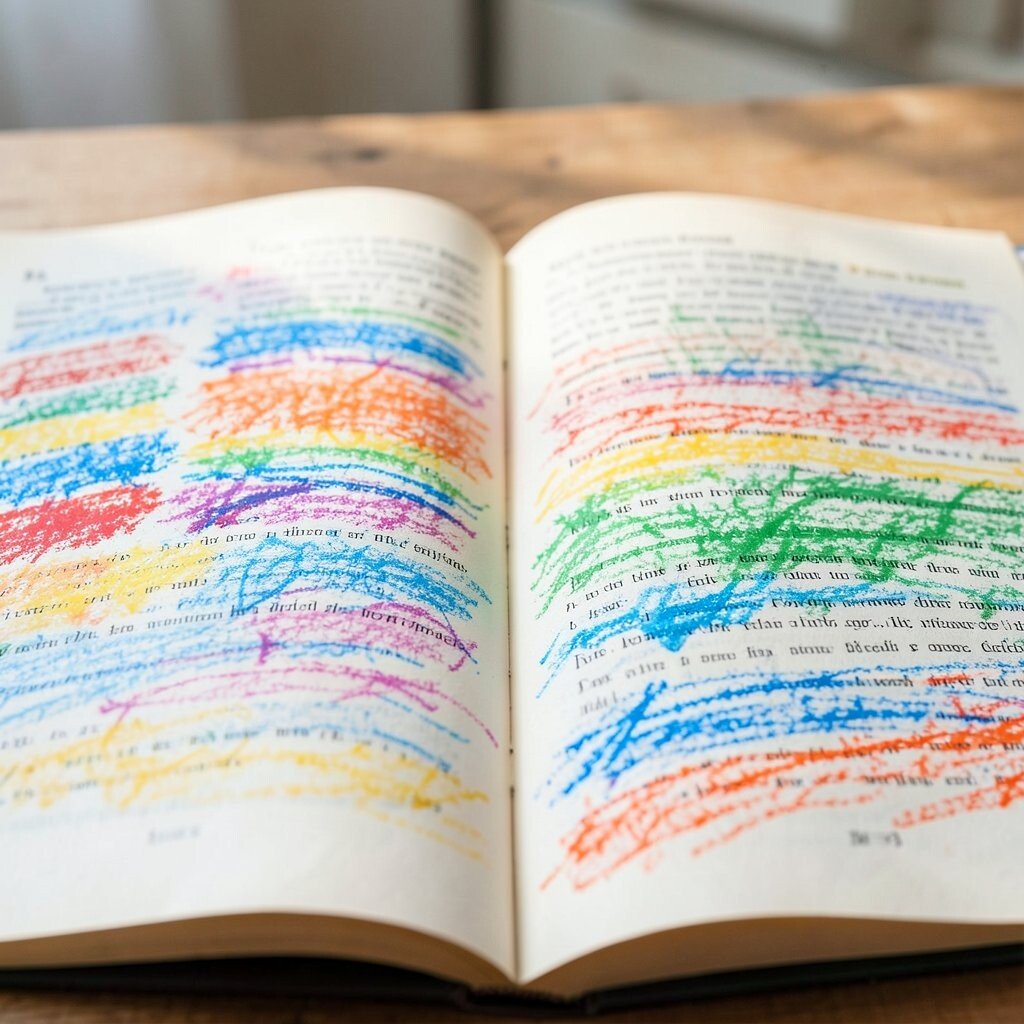Old book pages create a charming background for crayon art. The printed words peek through the color and give the page a dreamy, layered look.
