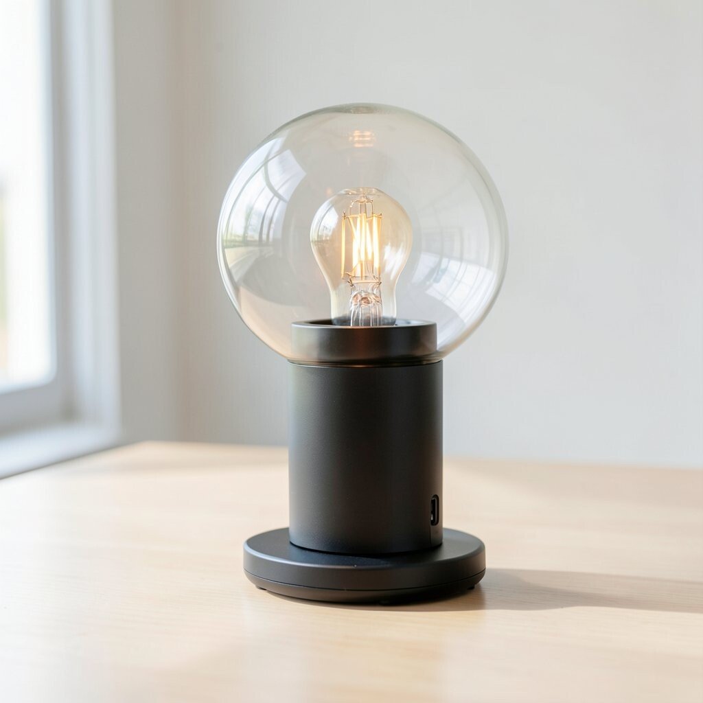 This lamp features a sleek glass dome that encases a soft light. Its minimalist design is both elegant and modern.