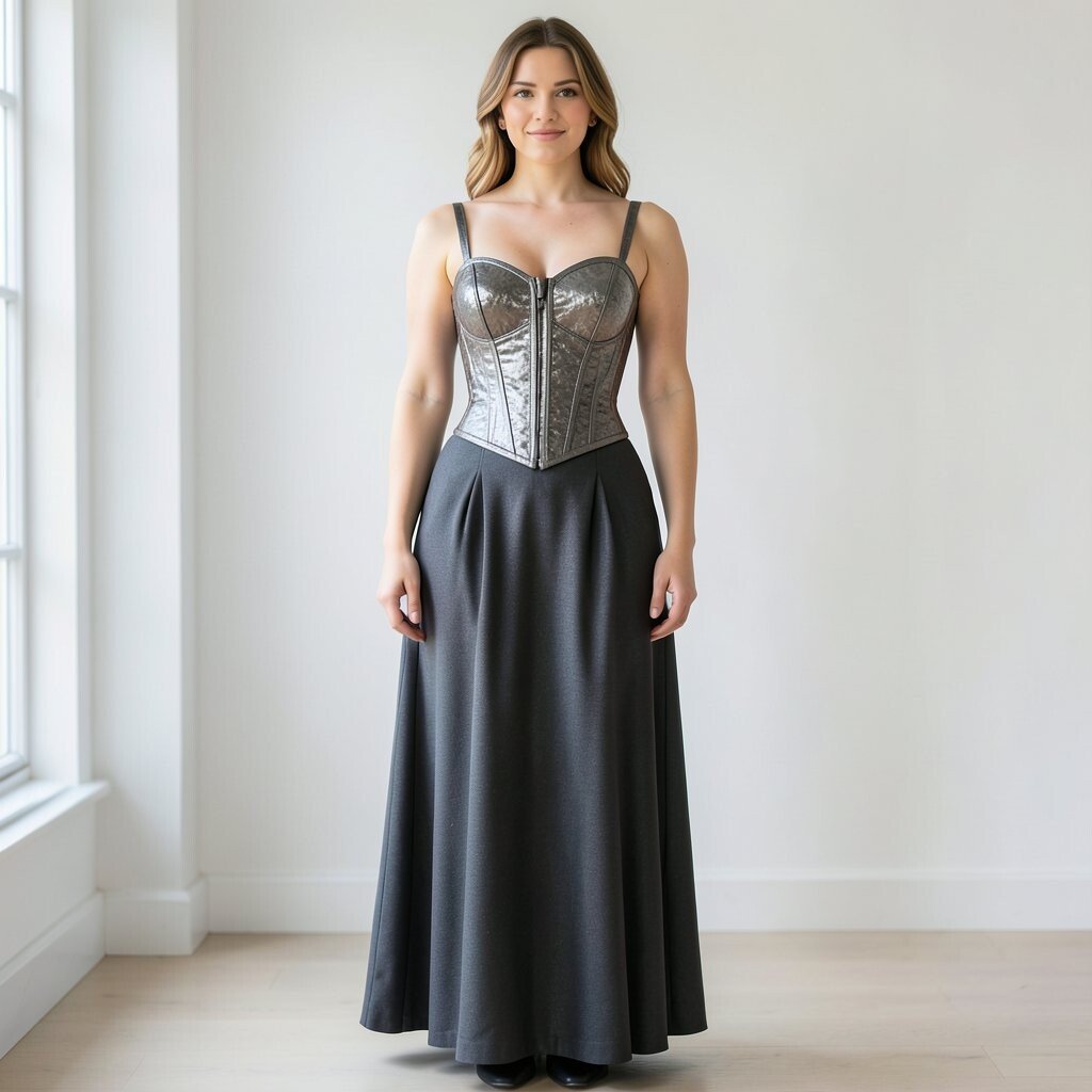 Shine bright in a metallic corset maxi dress. This style is perfect for evening events or parties.