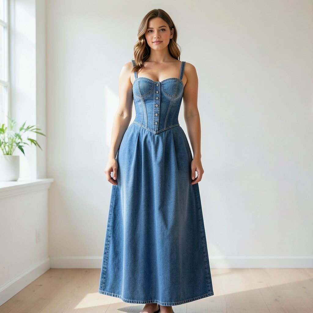 The denim corset maxi dress combines casual with chic. It’s a versatile piece that works for day and night.