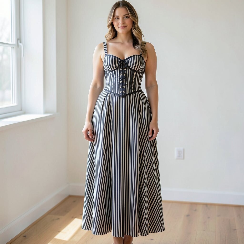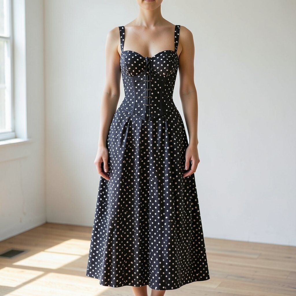 Polka dots bring a playful and vintage vibe to the corset maxi dress. This print is both charming and timeless.