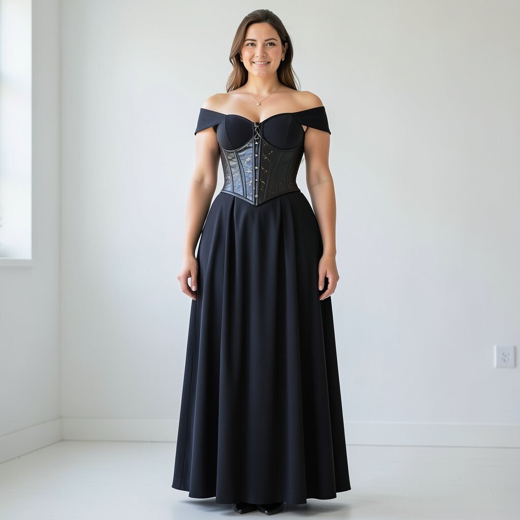 The off-shoulder design adds a touch of flirtation. Paired with a corset, it offers a flattering fit. The combination makes it a showstopper for any evening event.