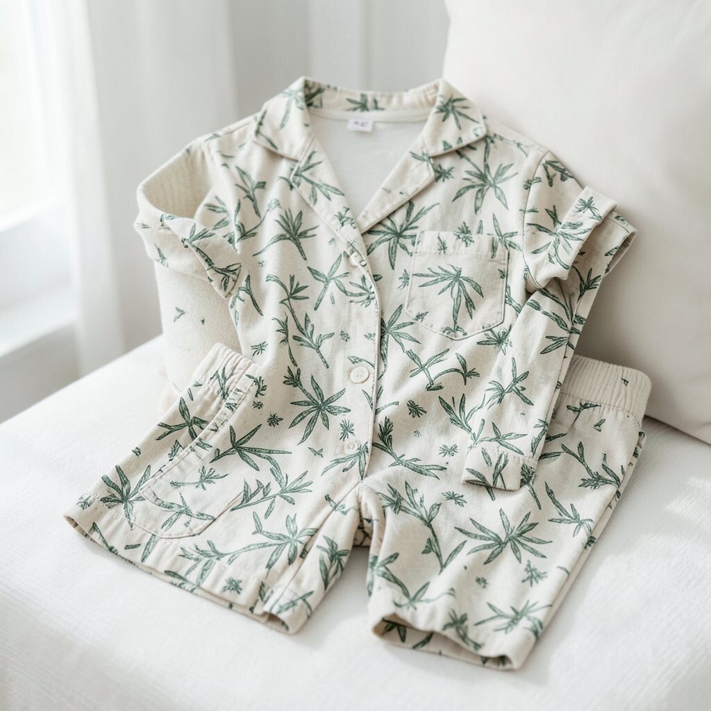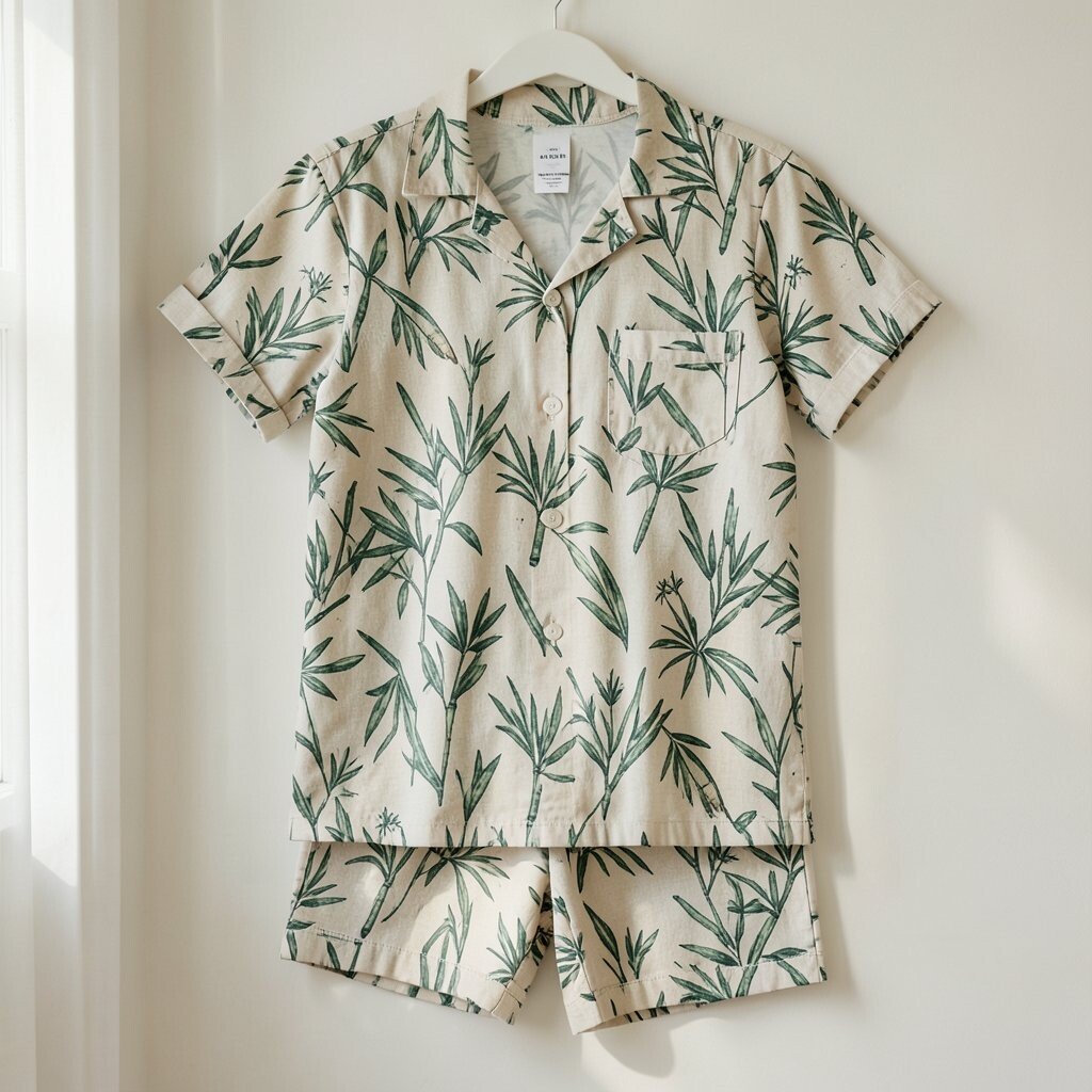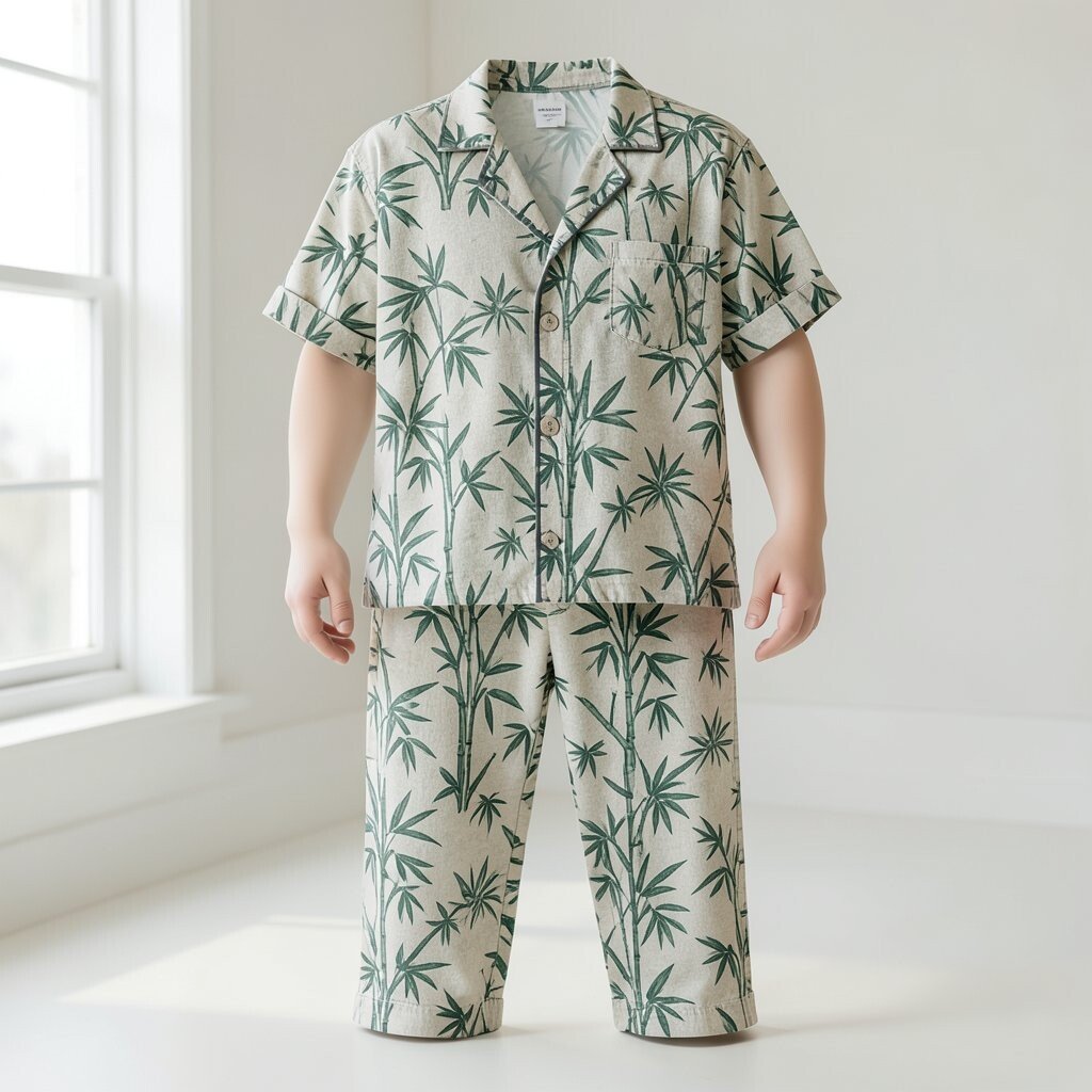 The set includes a button-up top and matching pants, offering a coordinated look. The soft bamboo fabric ensures a comfortable night’s sleep.