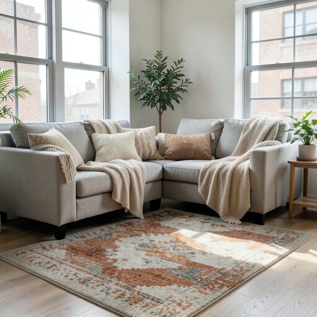 Lay down a warm-toned rug to anchor your space. It adds texture and warmth underfoot.