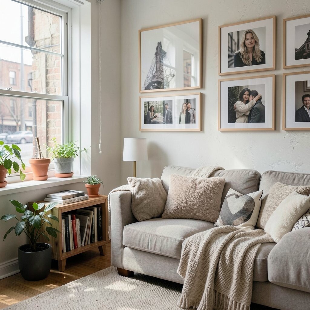 Create a gallery wall with your favorite photos or art prints. Use different frame styles for added interest.