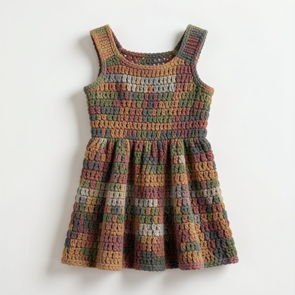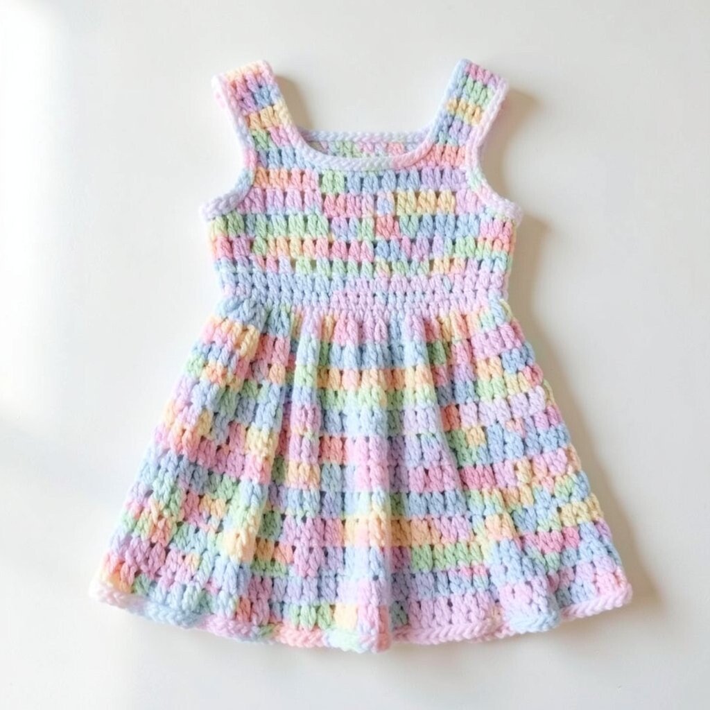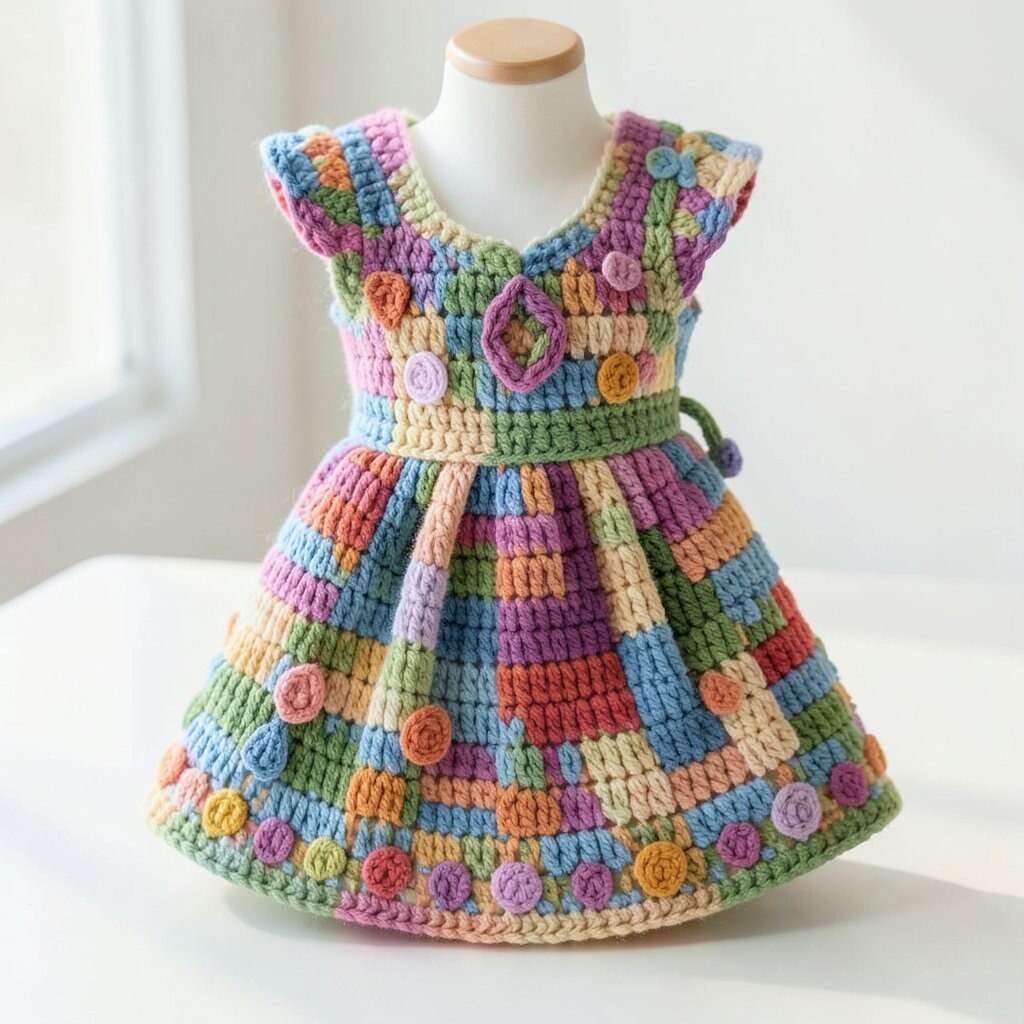 This design is perfect for showcasing your crochet skills in a fun way. Each square can be a different color, making every dress unique.