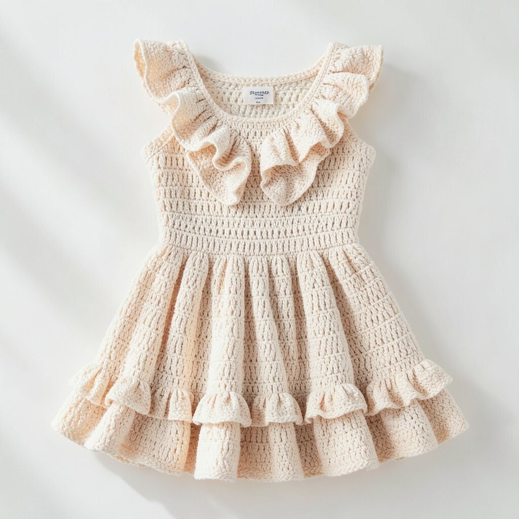 Use soft yarns and gentle colors for a dreamy effect. Ruffles can be placed at the sleeves, hem, or bodice for added flair.