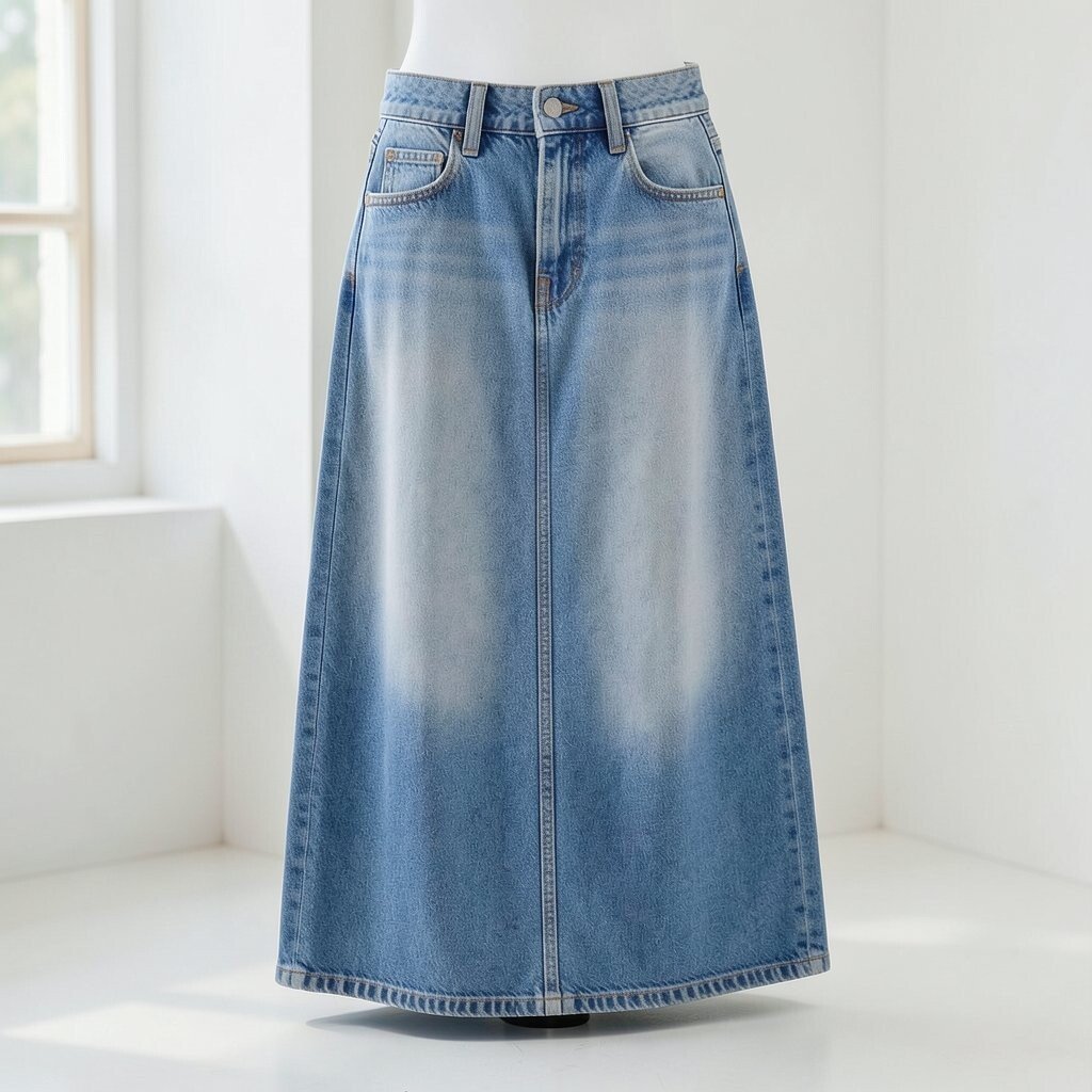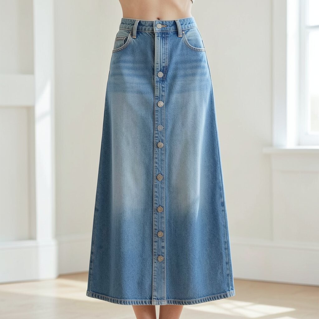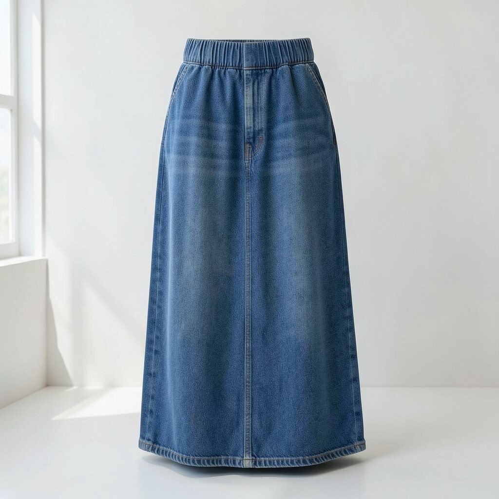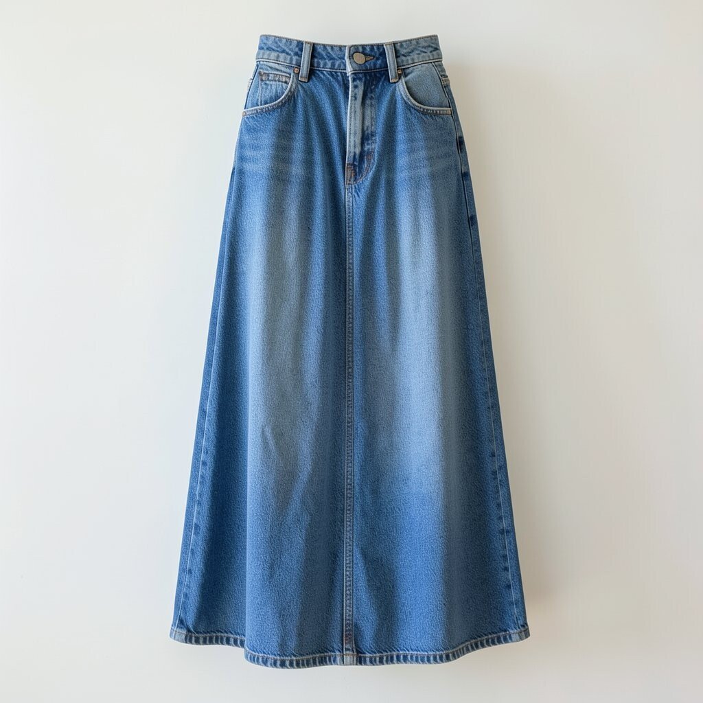 The classic A-line denim maxi skirt is a timeless piece. Its silhouette flatters all body types.