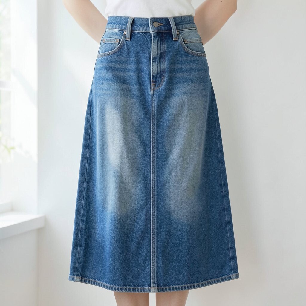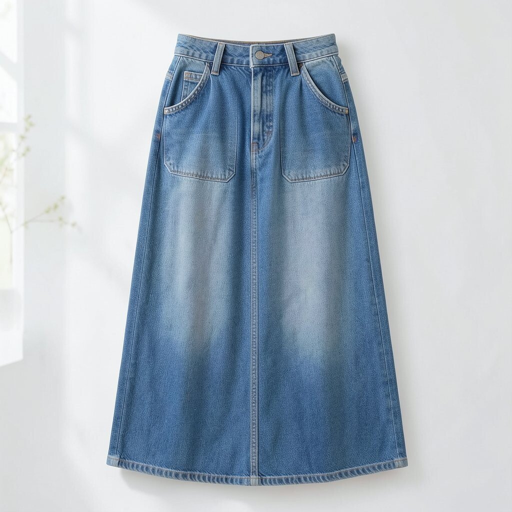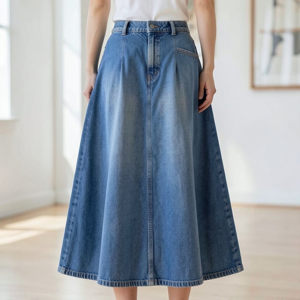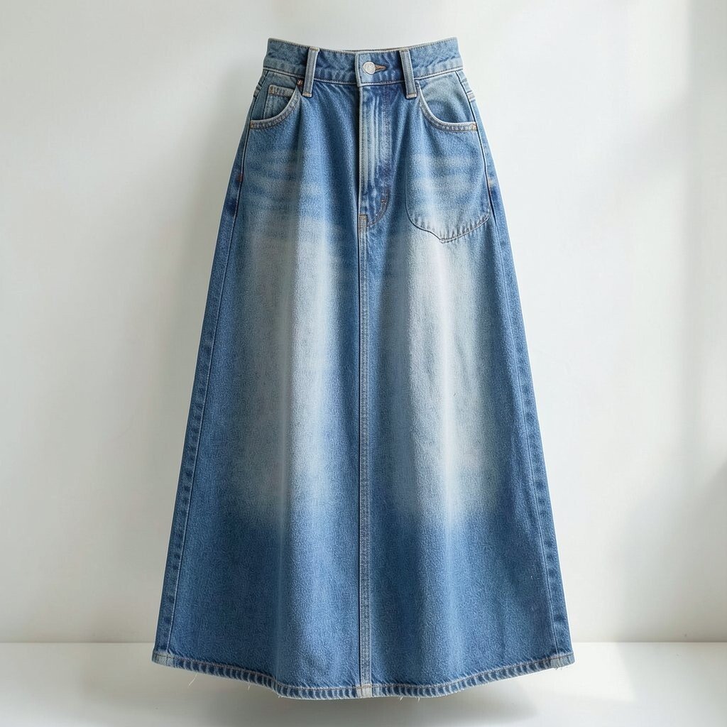 The classic A-line denim maxi skirt is a timeless piece. Its silhouette flatters all body types.