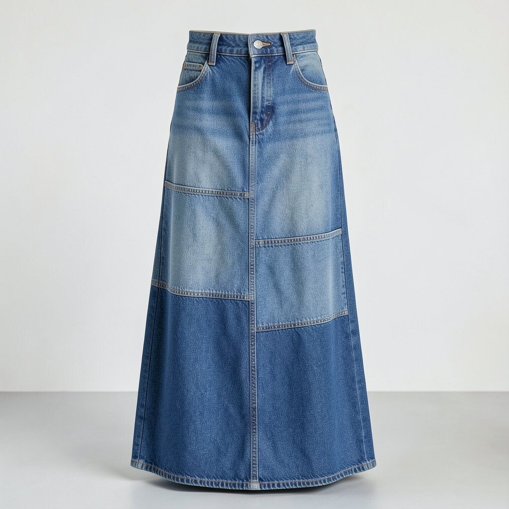 Patchwork denim maxi skirts are perfect for a bold fashion statement. They combine different shades of denim into one unique piece.