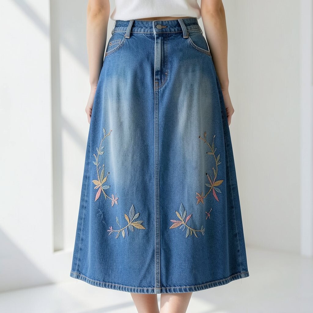 Embroidered denim maxi skirts are unique and eye-catching. The colorful threads add a splash of personality.