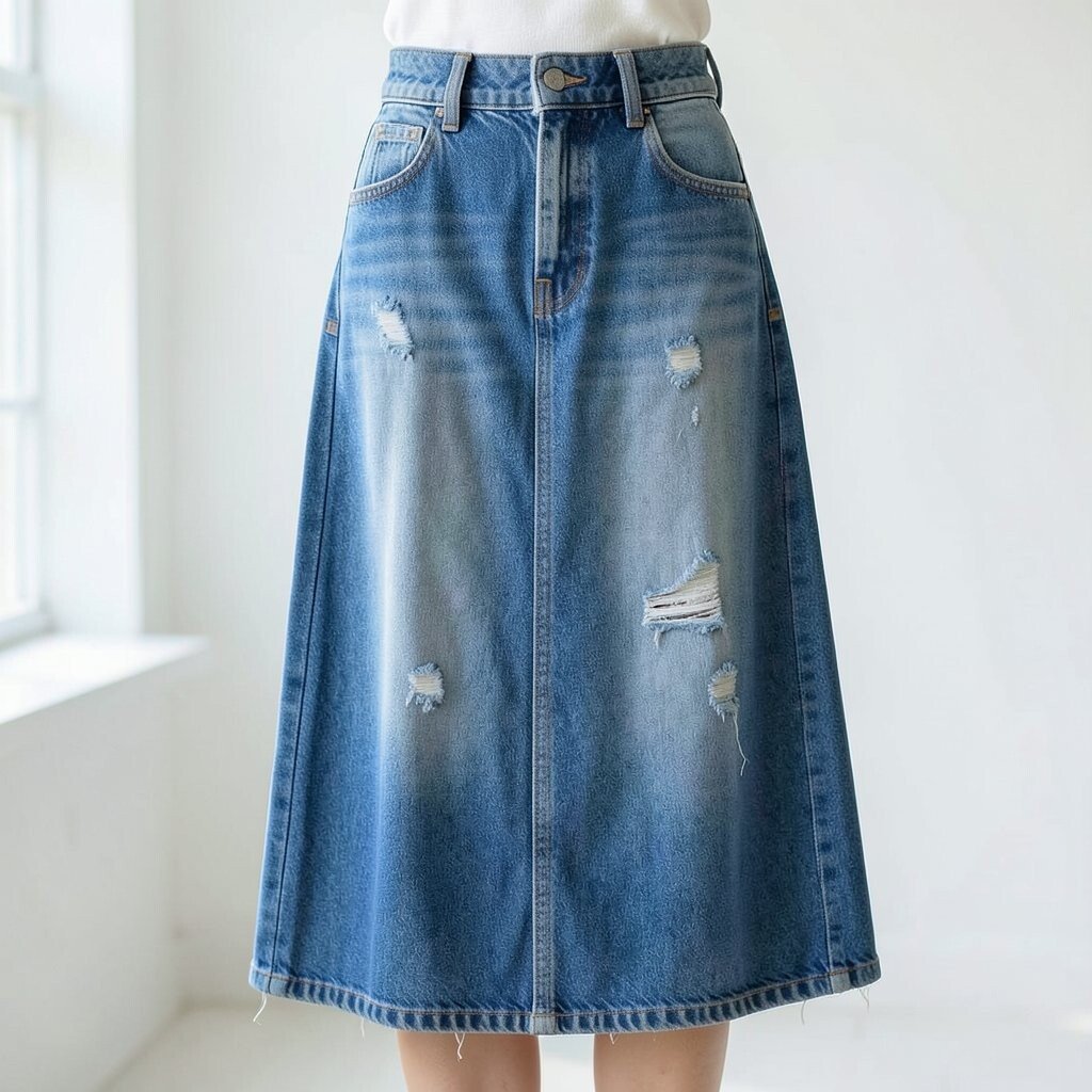 Distressed denim maxi skirts add a touch of edginess. The frayed hems and worn-out look are trendy this season.